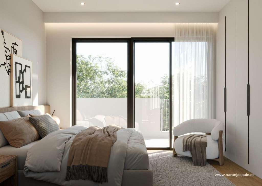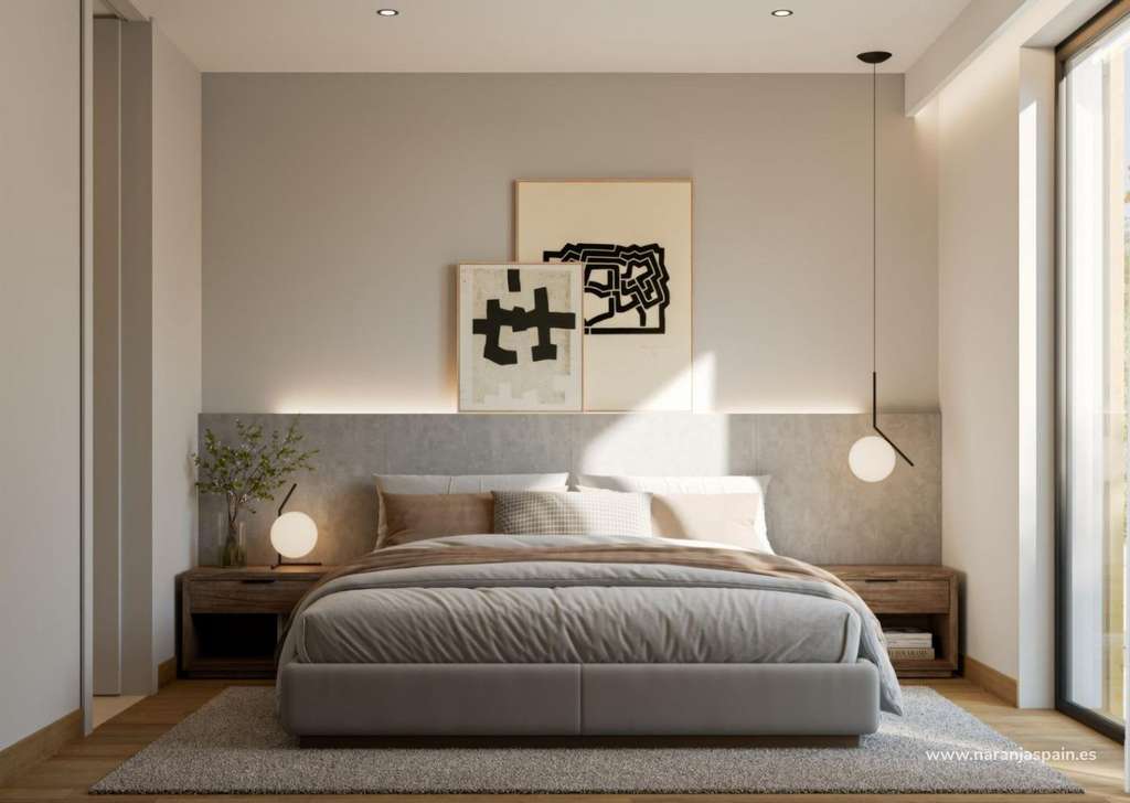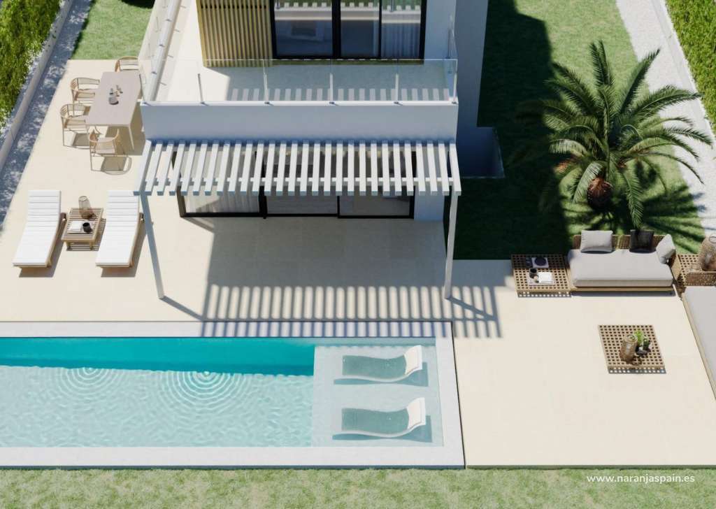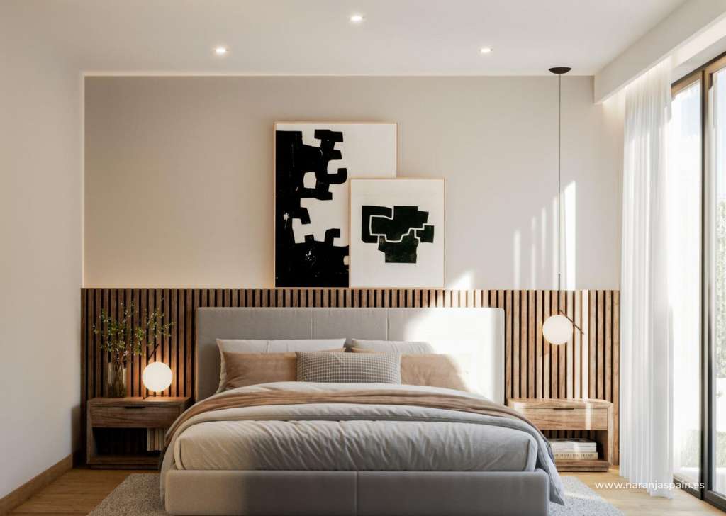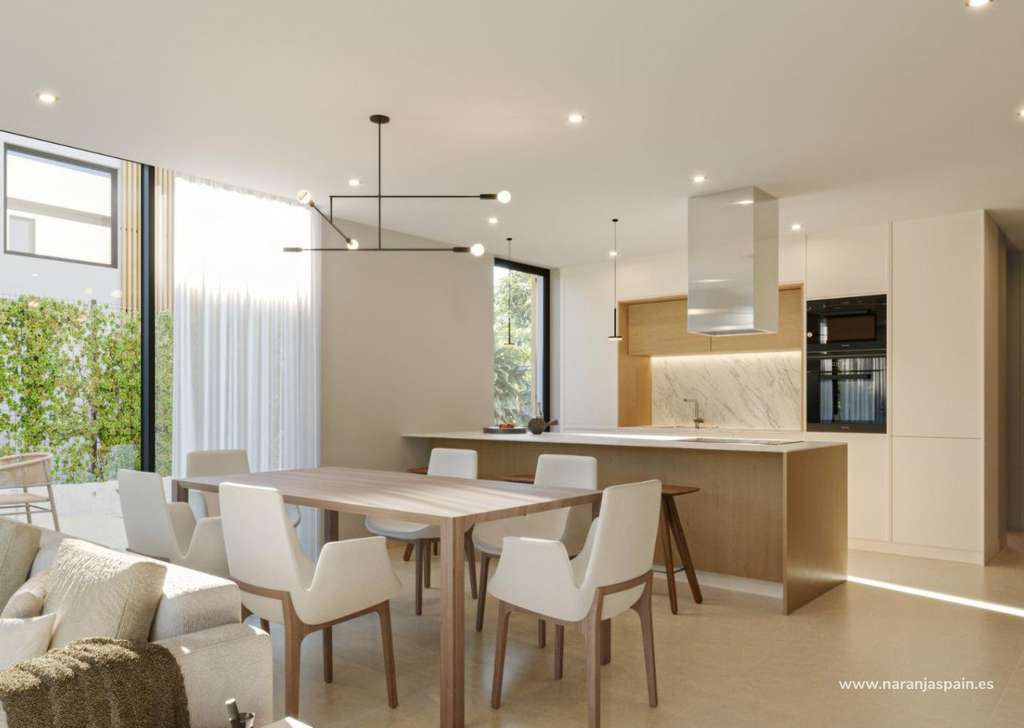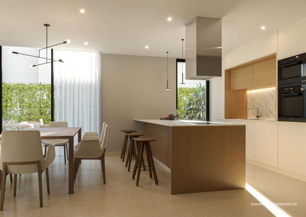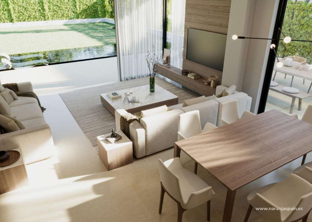 Todas las villas tienen 3 dormitorios, 2 o 3 baños, cocina americana con salón, armarios empotrados, aire acondicionado y aerotermia, cocina equipada, jardín privado con piscina y parking.