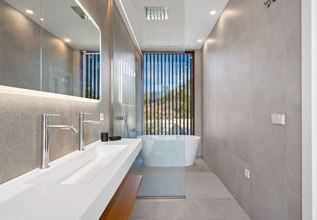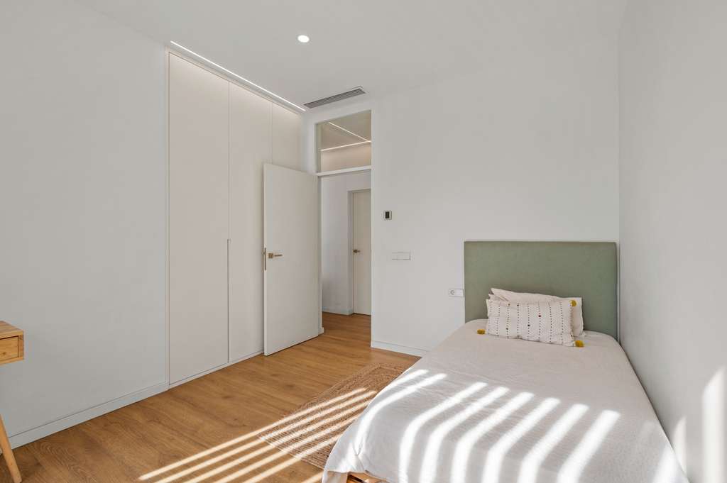 Tras ella, descubres el hall, donde da acceso a la zona más íntima de la vivienda: la suite principal. Una habitación donde el silencio y el relax manda. Un enorme ventanal donde contar estrellas por la noche o dejar entrar el amanecer cada mañana. Vestidor amplio junto al baño en suite, donde espera una bañera de diseño para dejar el día atrás con un baño de espuma… O una larga y tendida ducha mientras observas el imponente Puig Campana.