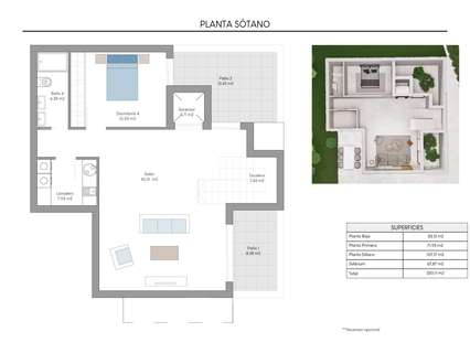 Villas construidas de 2 plantas, más sótano, y tiene 4 dormitorios, 4 baños, cocina americana con salón, armarios empotrados, solarium privado, jardín con piscina y plaza de aparcamiento para 2 coches.
