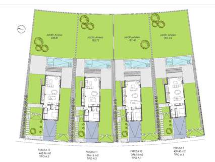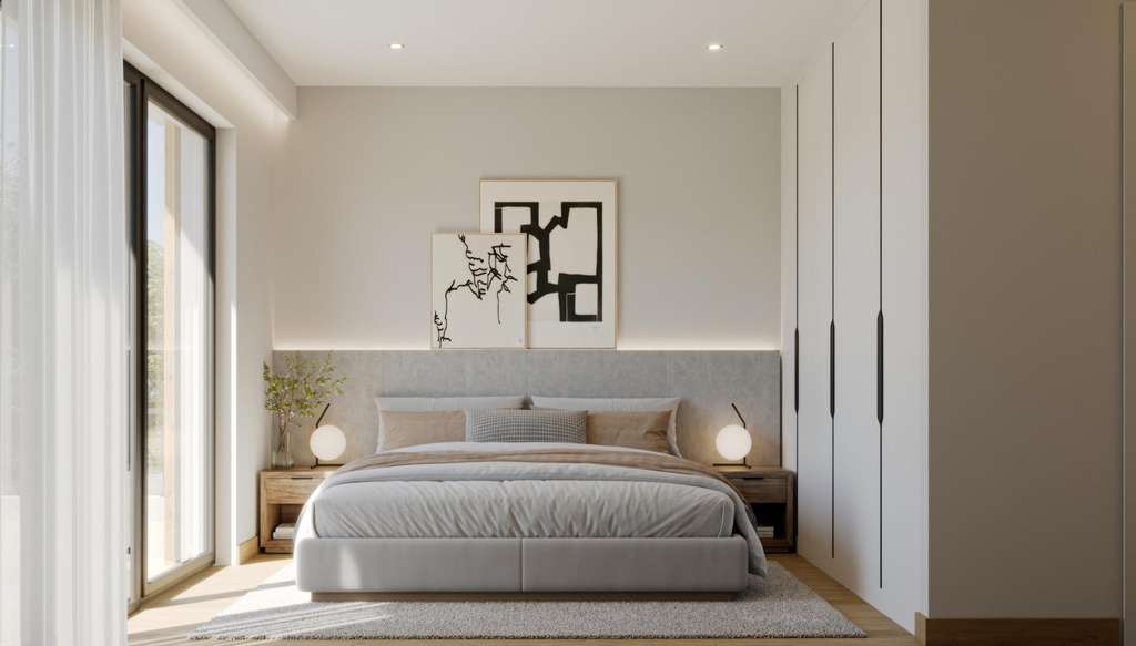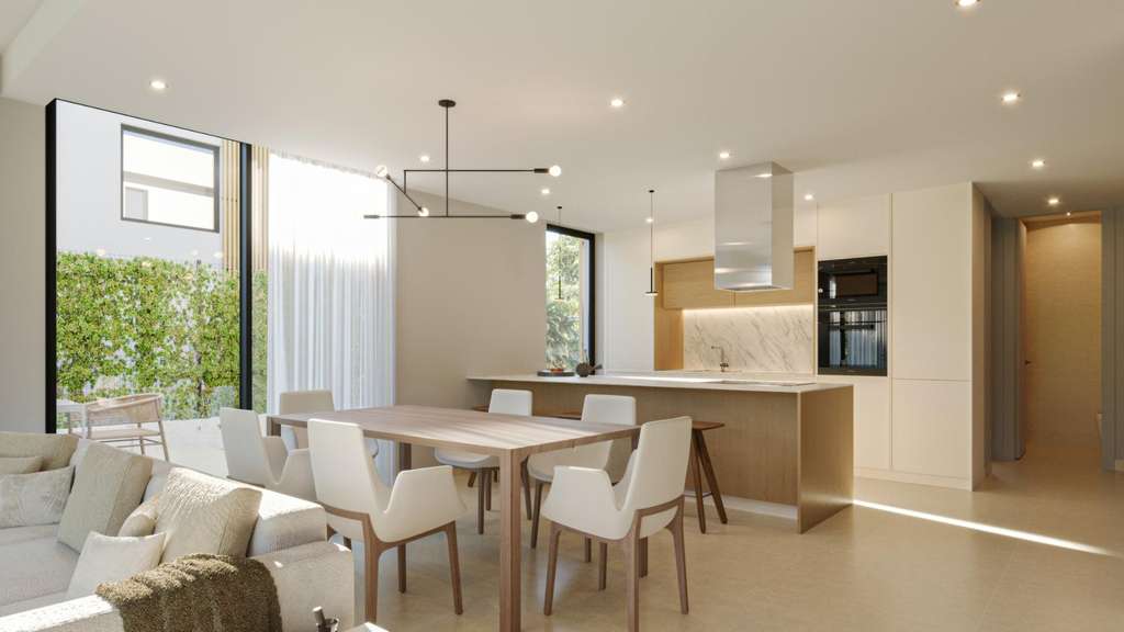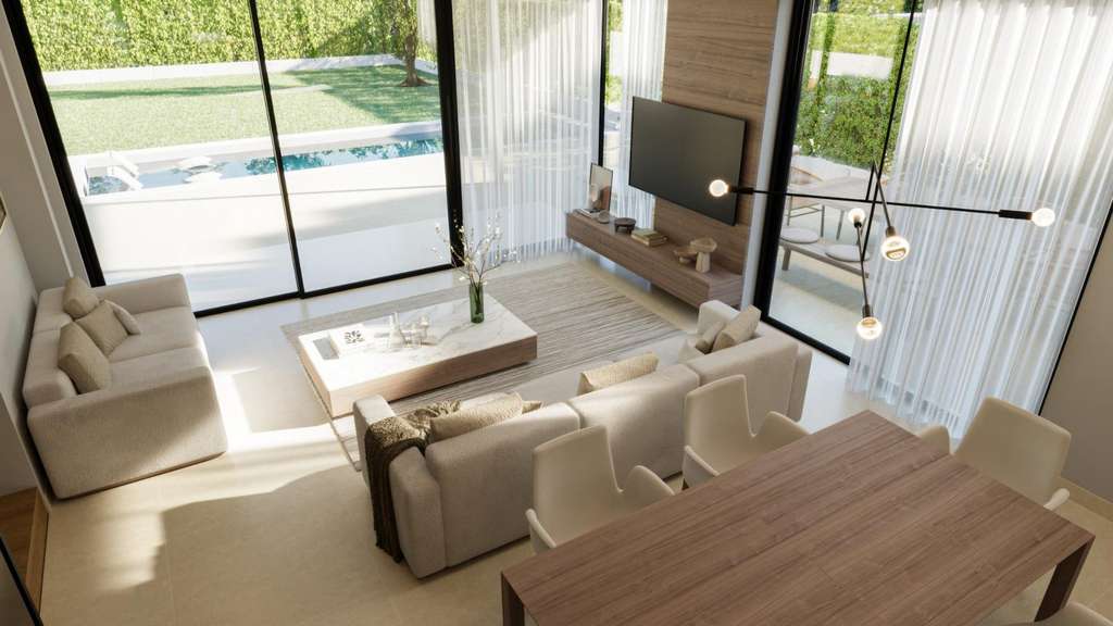 Todas las villas tienen 3 dormitorios, 2 o 3 baños, cocina americana con salón, armarios empotrados, aire acondicionado y aerotermia, cocina equipada, jardín privado con piscina y parking.