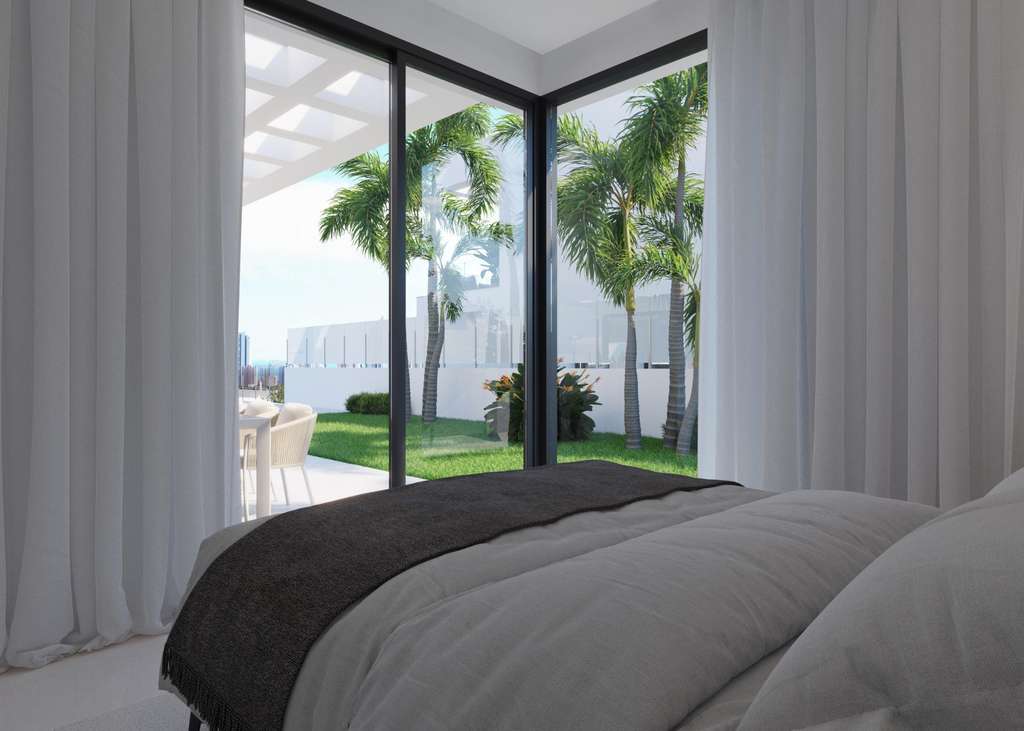 Villas modernas de 3 dormitorios y 3 baños, cocina americana con salón, terraza con magníficas vistas sobre Benidorm, jardín privado con piscina, sótano, parking y trastero.