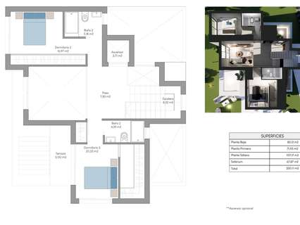 Las villas se distribuyen en 2 plantas y disponen de 3 dormitorios, 3 baños, cocina americana con salón, armarios empotrados, solarium privado, jardín con piscina y aparcamiento para 2 coches.