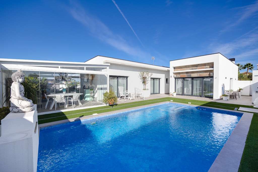 Superficie: 150 m² construidos, 501 m² parcela Dormitorios: 3 + encantadora casa de huéspedes Baños: 3 baños modernos Mobiliario: Totalmente amueblado, listo para entrar a vivir. Piscina: Piscina privada, perfecta para relajarse y disfrutar de los días soleados. Jardín y terraza: Jardín soleado y amplia terraza, ideal para barbacoas, tomar el sol y disfrutar de agradables veladas. Instalaciones: Aire acondicionado, trastero, parking. Diseño: Único, moderno y elegante.