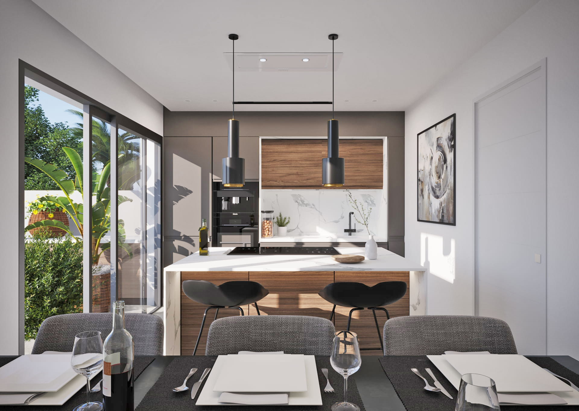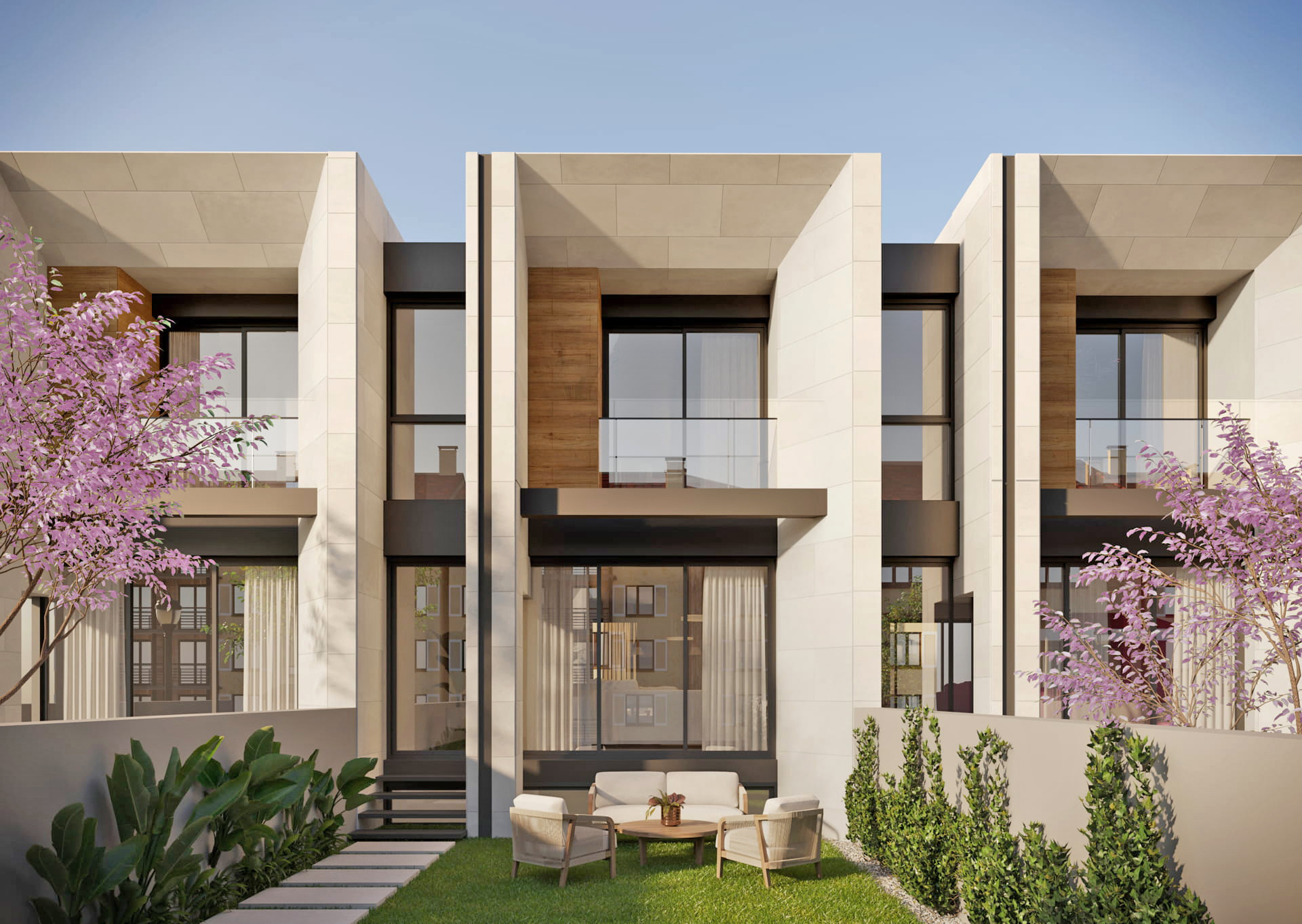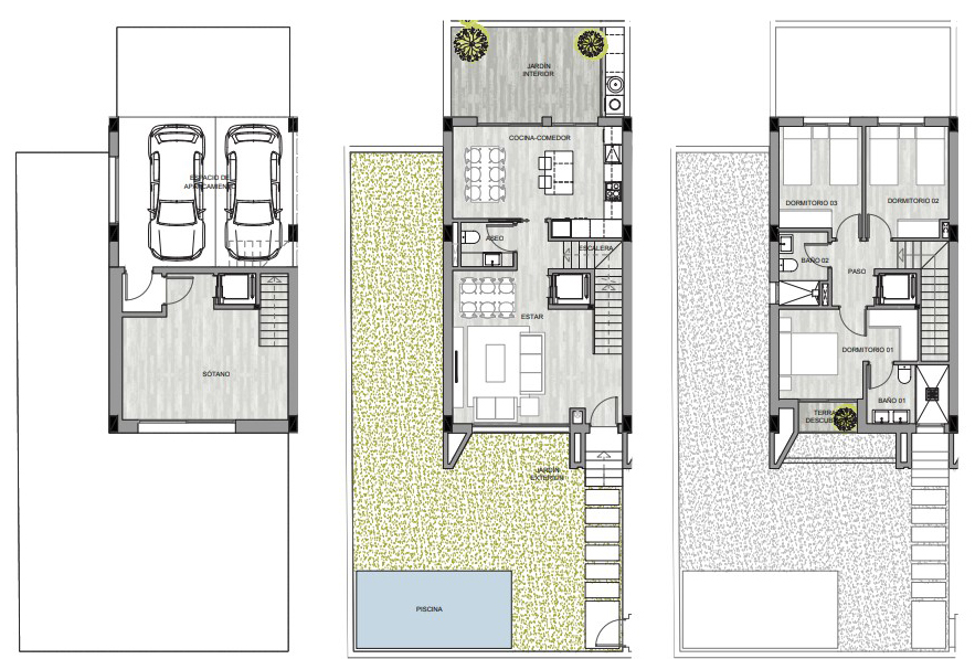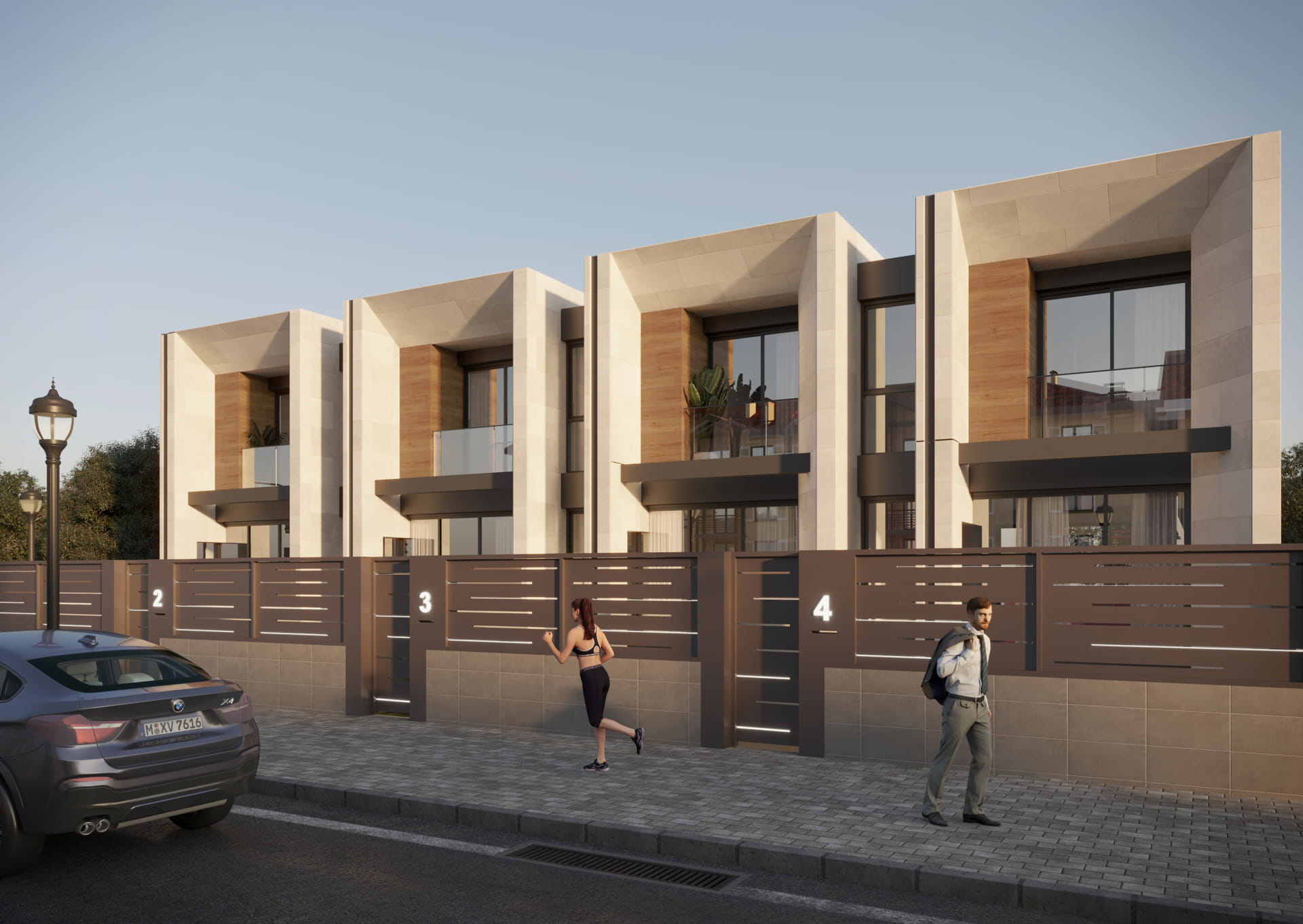 Cada propiedad está equipada con su propia piscina pequeña y zona ajardinada. Cada uno de los adosados tiene 3 plantas conectadas por escaleras (incluyendo la planta sótano que tiene 2 plazas de aparcamiento y un trastero. Acceso directo con escaleras a la planta baja con una gran cocina (con marcas de primera calidad Bosch o similares), un salón/comedor y un aseo de invitados. Desde la cocina, así como desde el salón/comedor hay acceso directo a la zona del jardín. Otra escalera conduce a la primera planta donde hay un total de 3 dormitorios y 2 baños y desde allí otra escalera conduce a la encantadora terraza de la azotea con fantásticas vistas.
