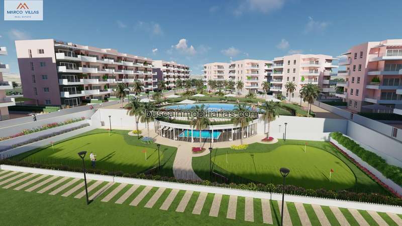Complejo con piscina, zonas verdes, greens de golf, Spa, parque infantil, maquinas biosaludables y zonas deportivas.