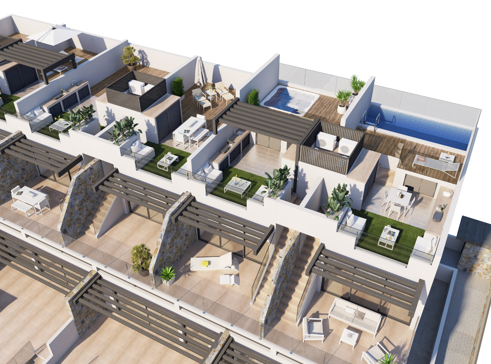 Todos los apartamentos tienen aparcamiento privado incluido, así como piscina comunitaria.