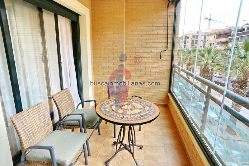 Espacioso salón-comedor completamente amueblado, que da acceso a una terraza acristalada con cortinas de cristal, ofreciendo agradables vistas al paseo de la avenida de Cervantes.