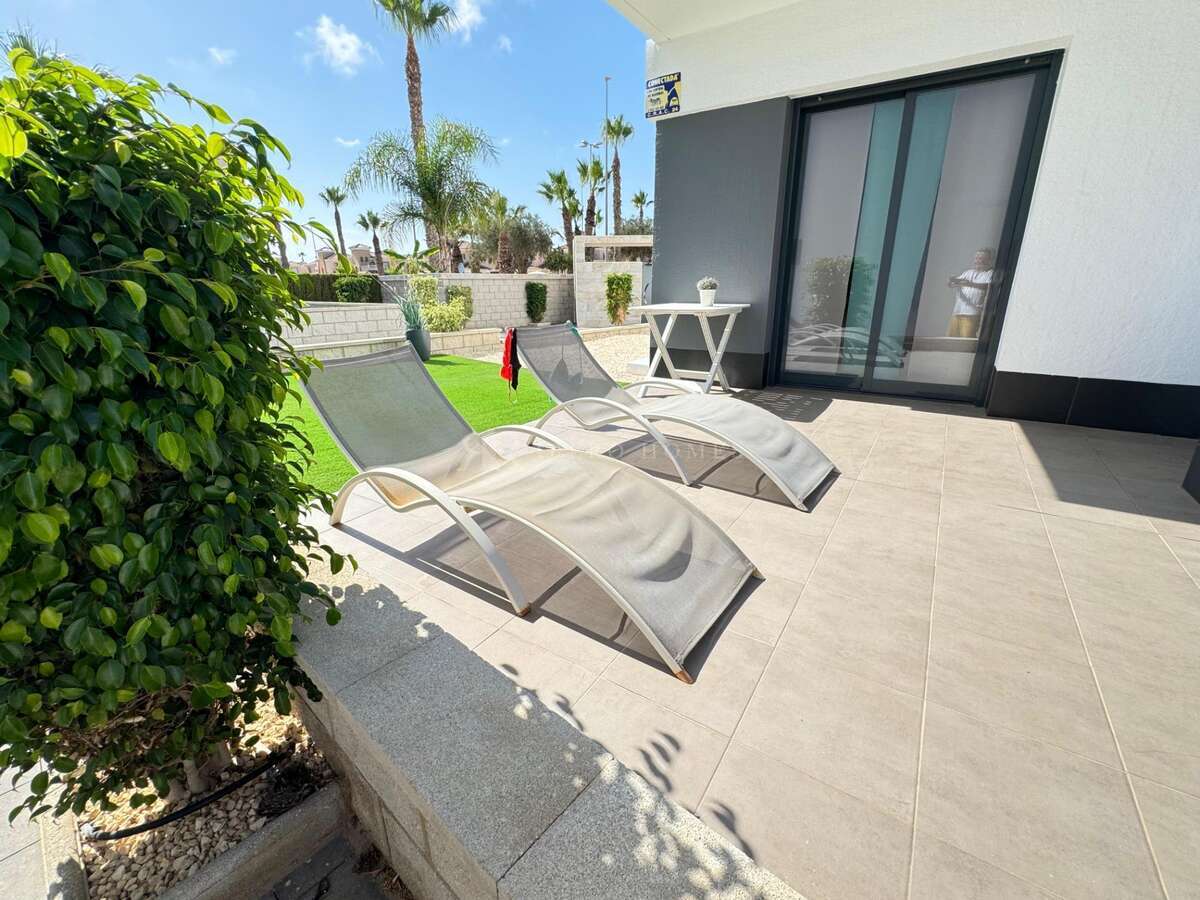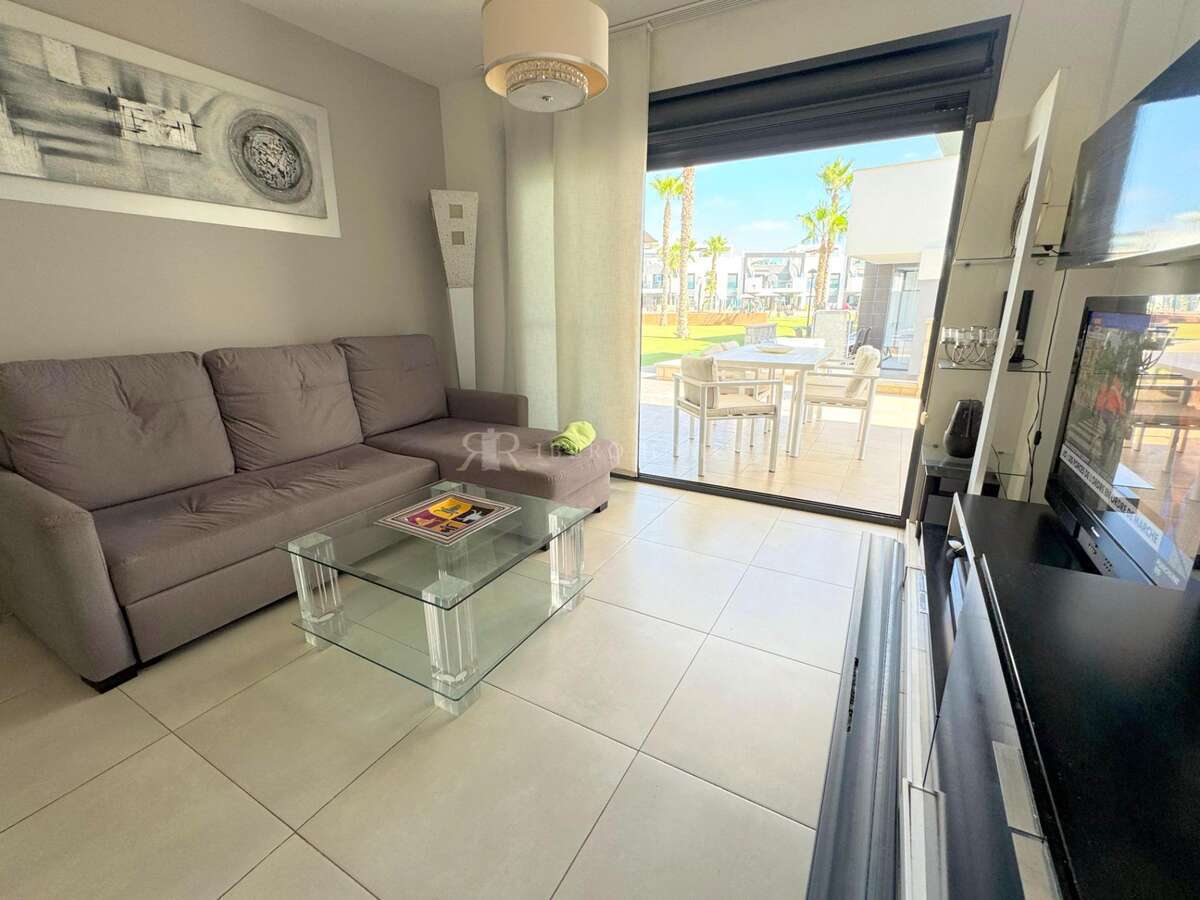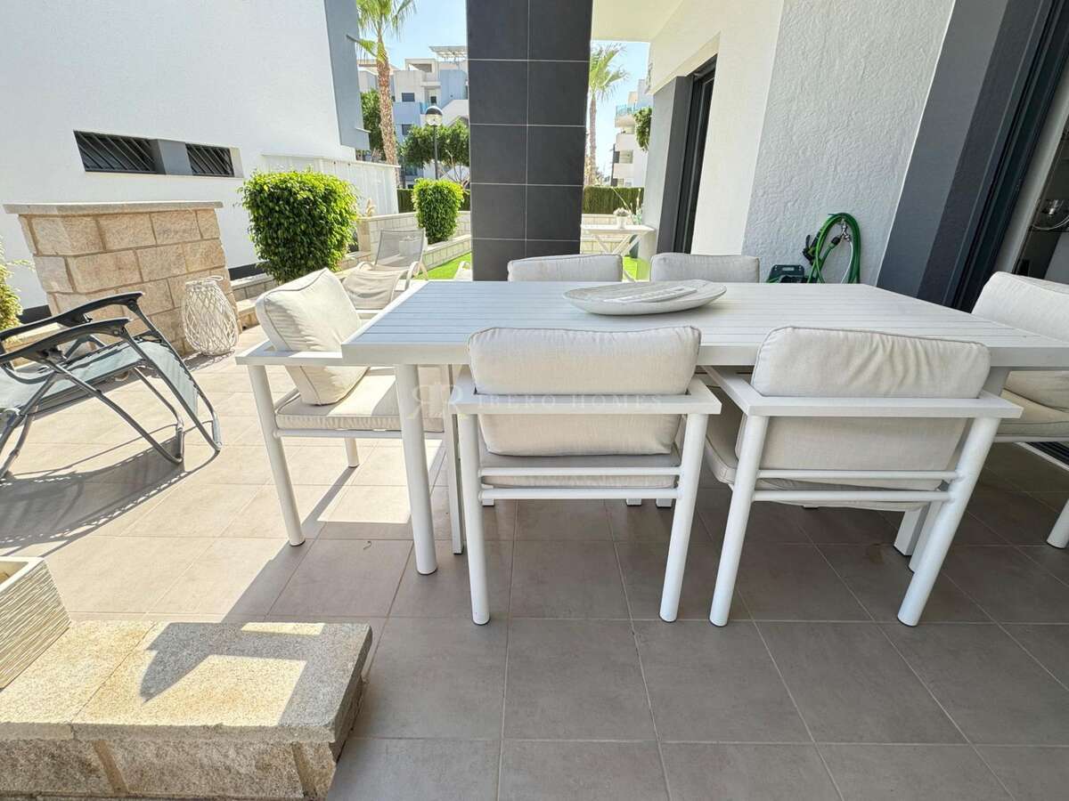 Guardamar del Segura, El Raso, apartamento de alto standing en planta baja de 80 m2, en El Raso con un grand jardin de 180 m2 frente a la piscina comunitaria. Dispone de 2 dormitorios, 1 en suite, 2 baños, cocina americana y amplio salon/comedor. La vivienda se vende amueblada y equipada con su plaza de parking subterraneo, el residencial cuenta con gimnasio, SPA, parque infantil, pista de petanca, mini golf etc.~