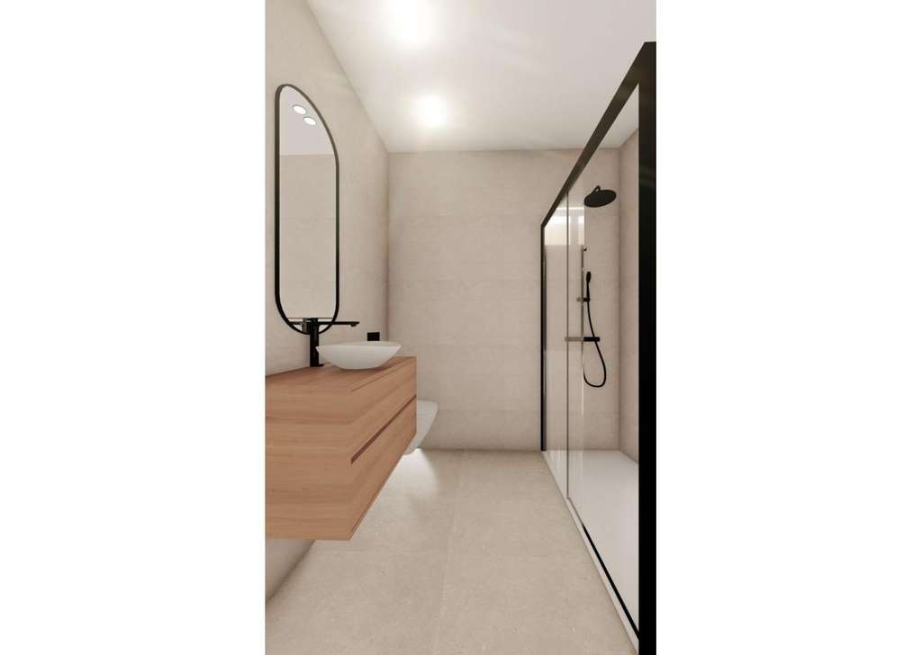 Muebles de baño suspendidos con lavabo integrado, espejo y mamparas de ducha correderas