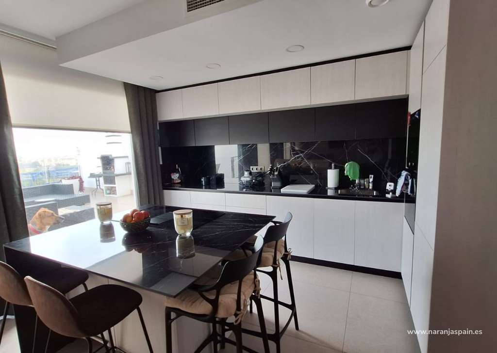 El apartamento cuenta con una distribución moderna y funcional que aprovecha al máximo la luz natural. El salón-comedor de concepto abierto se integra perfectamente con la cocina moderna y ofrece acceso directo a la gran terraza, creando un espacio ideal para el descanso y el entretenimiento.