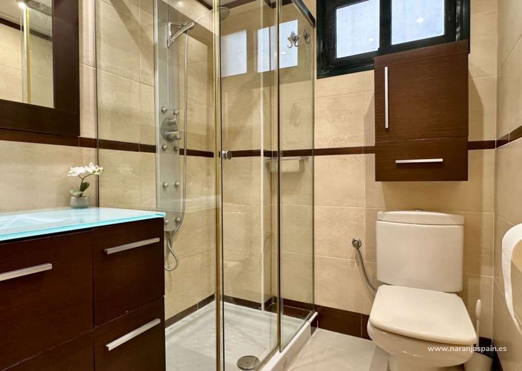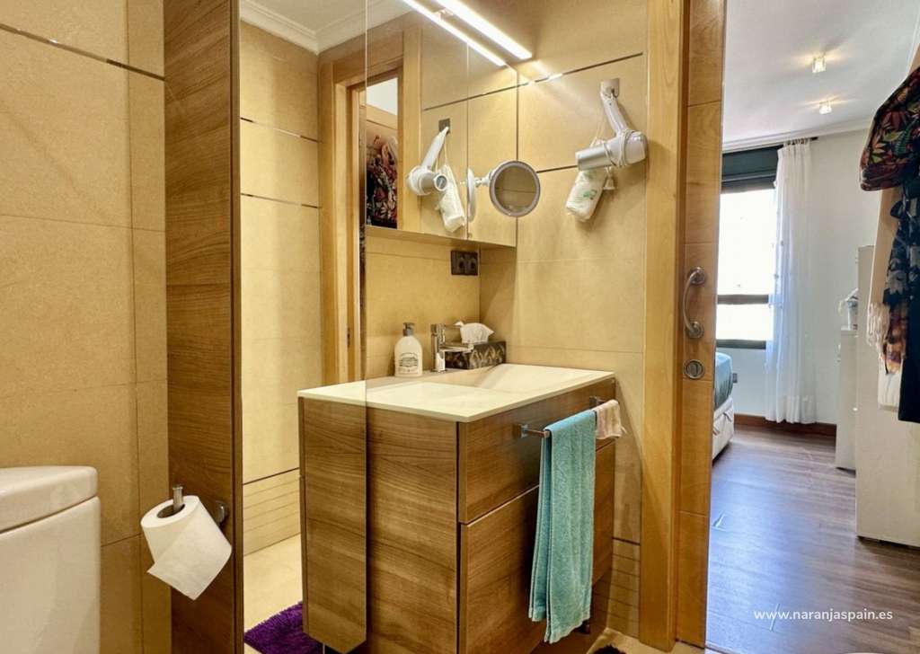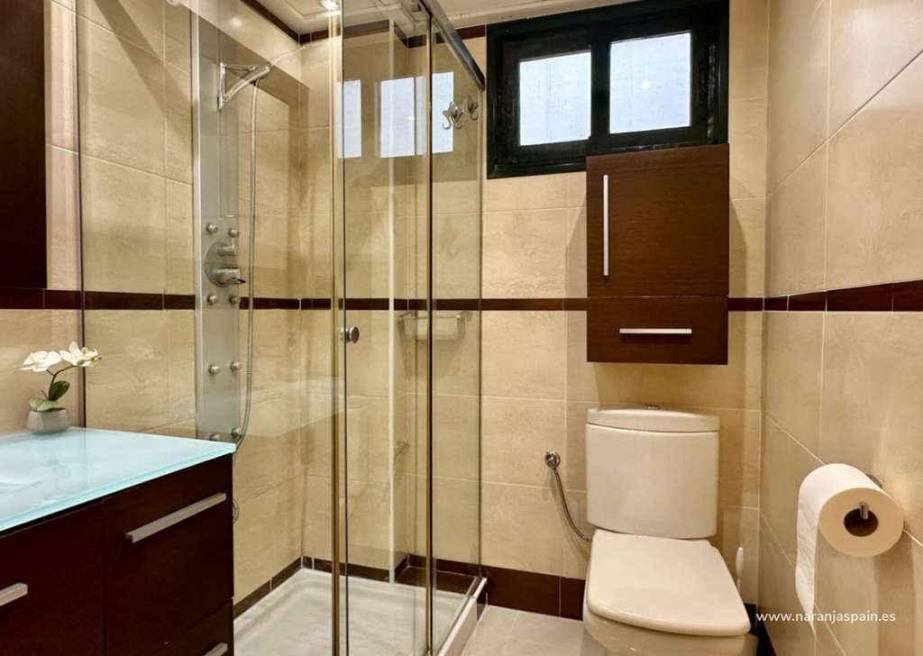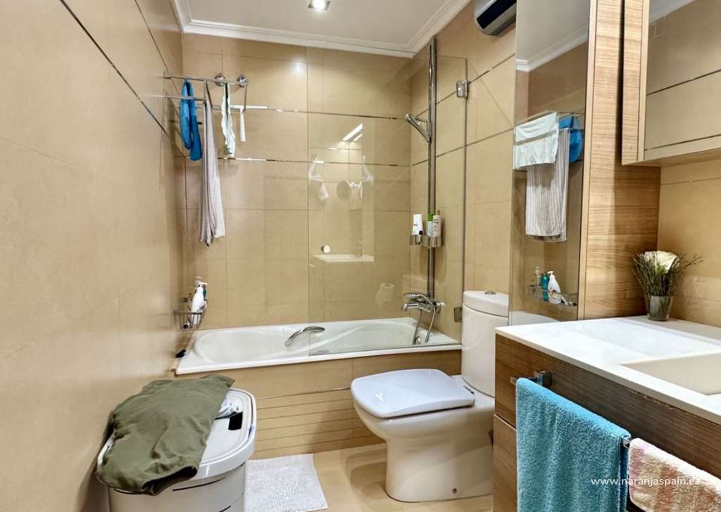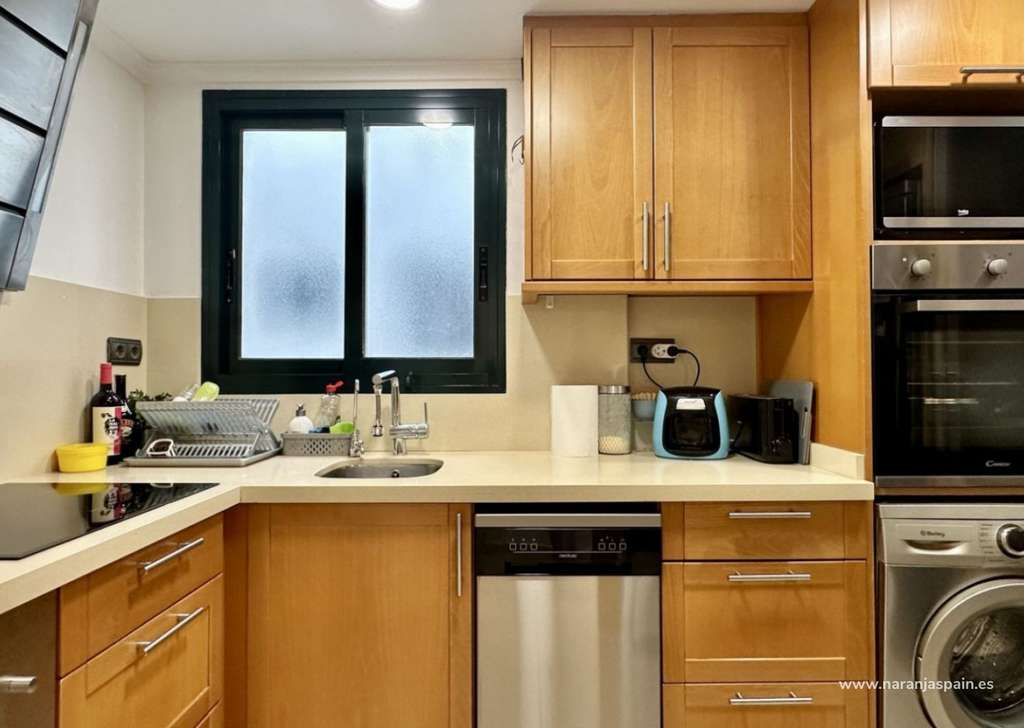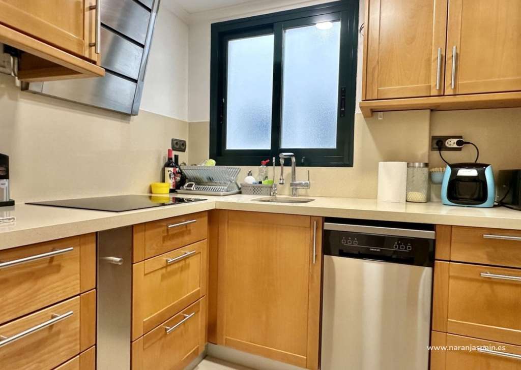 Con una superficie total de 78 m², la vivienda cuenta con un amplio salón, una cocina moderna completamente equipada con encimera de Silestone, placa de inducción, lavavajillas, sistema de ósmosis, campana plana y una gran despensa con luz automática. Dispone de dos dormitorios y dos baños, uno de ellos en suite con bañera. El segundo baño incluye columna de hidromasaje y grifería termostática. Las puertas correderas en cocina y baños optimizan el espacio.
