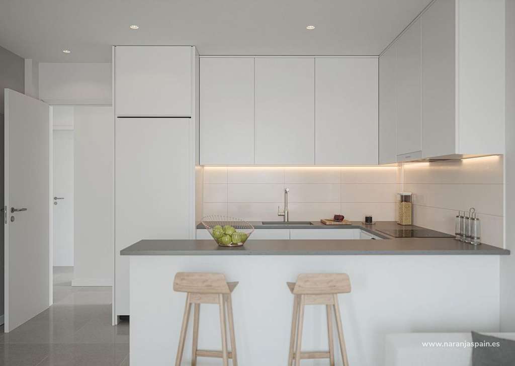 Esta moderna promoción consta de apartamentos de 2 y 3 dormitorios con 2 baños (uno de ellos en suite). Los compradores pueden elegir entre viviendas en planta baja con terraza y patio, apartamentos en plantas intermedias con terraza o áticos con solárium privado, ideales para disfrutar del sol y la brisa marina durante todo el año.