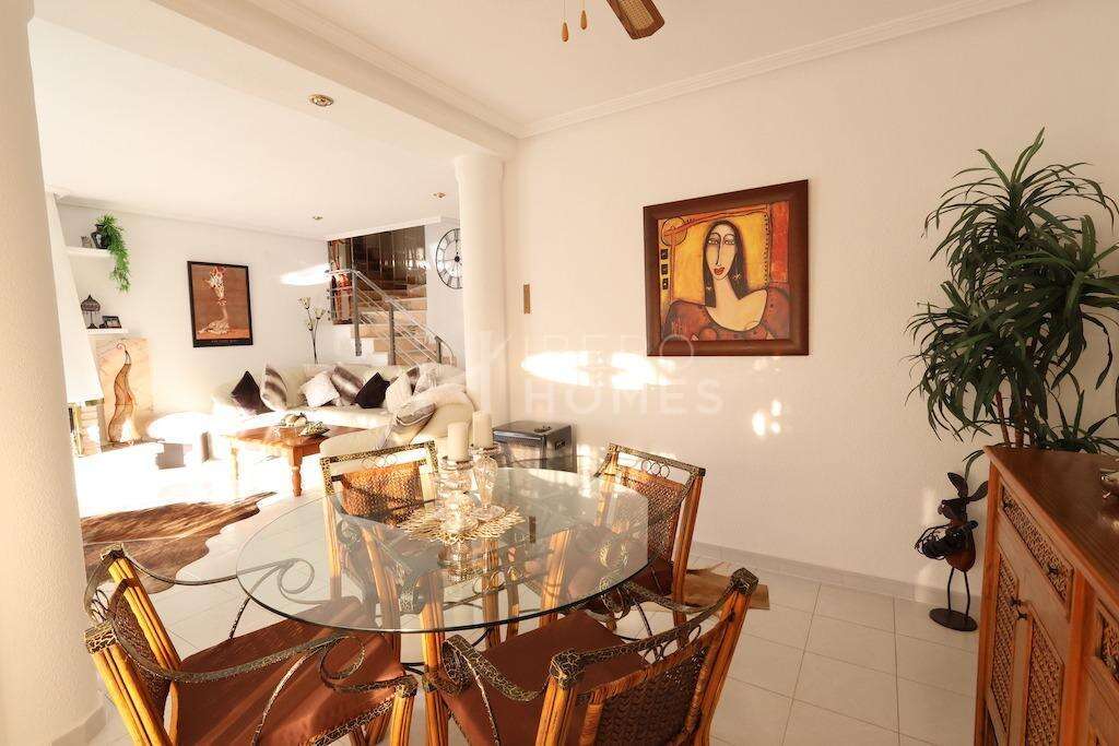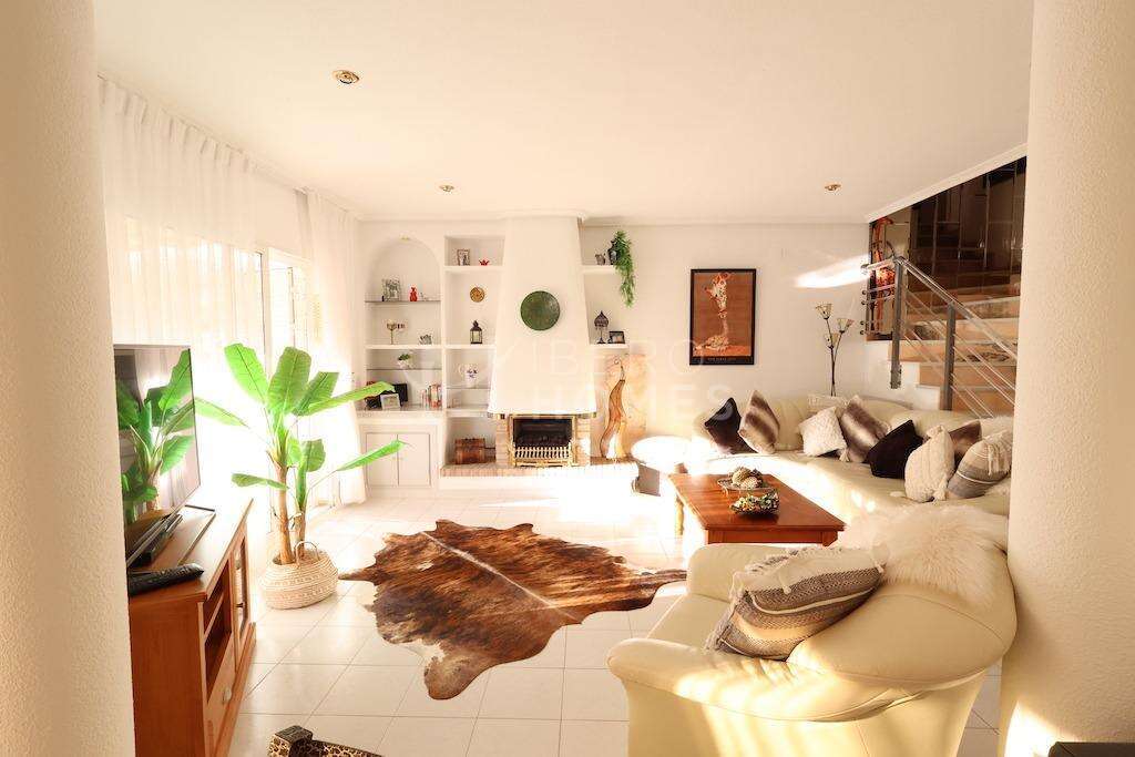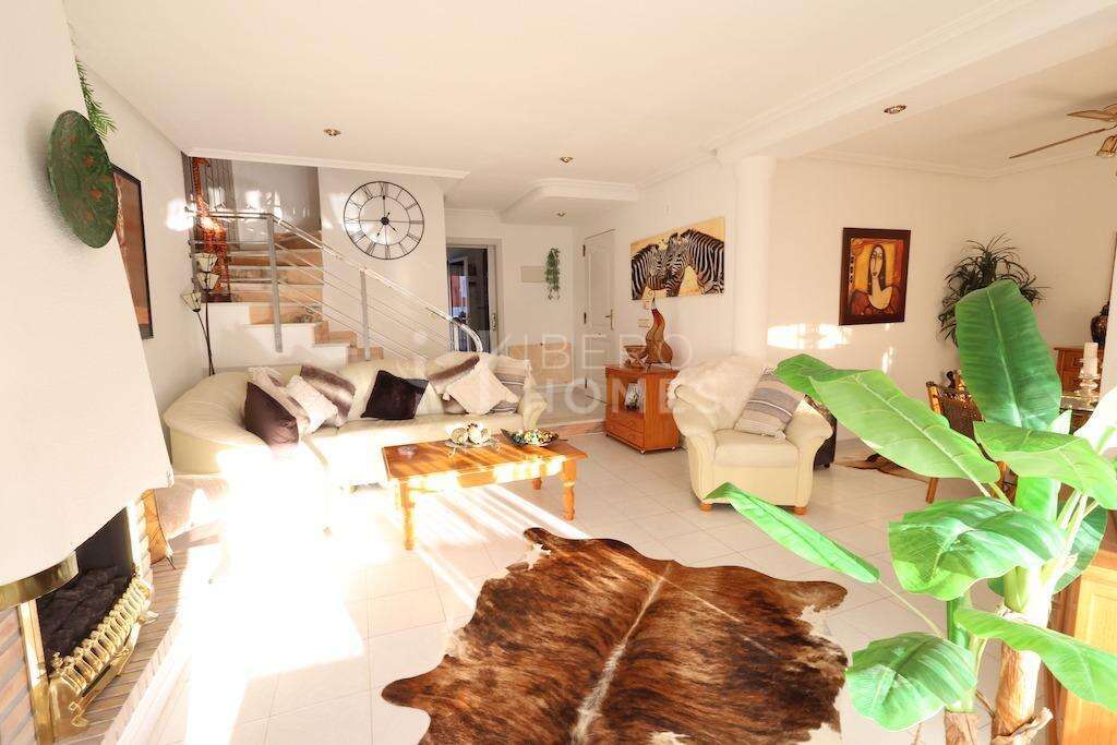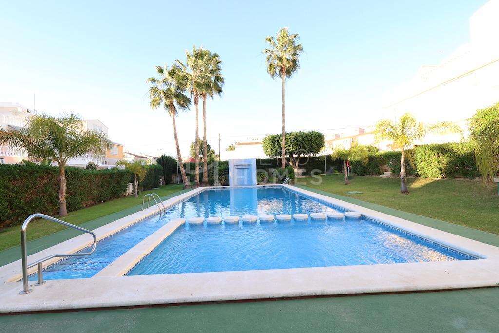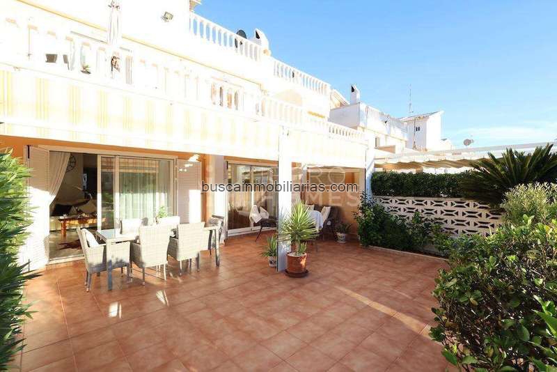 Guardamar Residencial Pórtico Mediterraneo, vivenda frente al jardinde 177 m2, la vivienda tiene 4 dormitorios, 2 baños, 1 aseo, gran salón comedor con chimenea de gas, cocina independiente, solarium con vistas panorámicas al parque natural, garaje cerrado, 2 terrazas una delantera muy grande y una mas pequeña en la parte trasera, el residencial cuenta con grandes zonas verdes y 2 amplias piscinas comunitarias, la vivienda se vende amueblada y cuenta con aire acondicionado.~