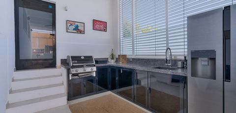 La zona exterior es un verdadero oasis con una piscina privada, una cocina exterior independiente con mesa de comedor y un montón de espacio para comer al aire libre y de entretenimiento. El paisaje circundante se suma a la sensación de tranquilidad y belleza.