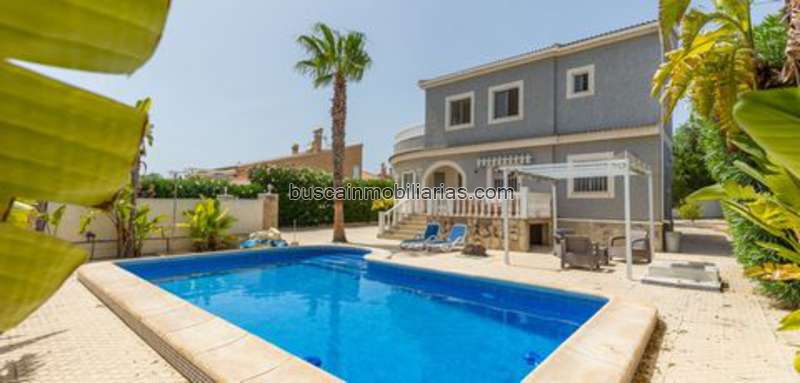 Presentamos una villa independiente situada en una parcela privada de 885 m², ubicada en la zona de La Marina, en San Fulgencio. La propiedad dispone de 5 dormitorios y 5 baños, incluyendo un baño exterior que puede utilizarse como baño de piscina o para invitados. La distribución de la vivienda la hace adecuada tanto para una familia numerosa como para uso vacacional. El interior ofrece un salón amplio y luminoso con chimenea, comedor, cocina totalmente equipada y un patio acristalado que puede utilizarse durante todo el año. Además, cuenta con lavadero y un cuarto de servicio. La propiedad dispone de terraza y solárium privado, proporcionando un espacio ideal para el descanso y el disfrute del sol. En el exterior se encuentra una piscina privada, un jardín bien cuidado y un garaje cerrado con capacidad para dos coches. La propiedad ofrece amplitud, privacidad y confort, con fácil acceso a servicios e infraestructuras locales. Contacte con nosotros para concertar una visita a la propiedad.