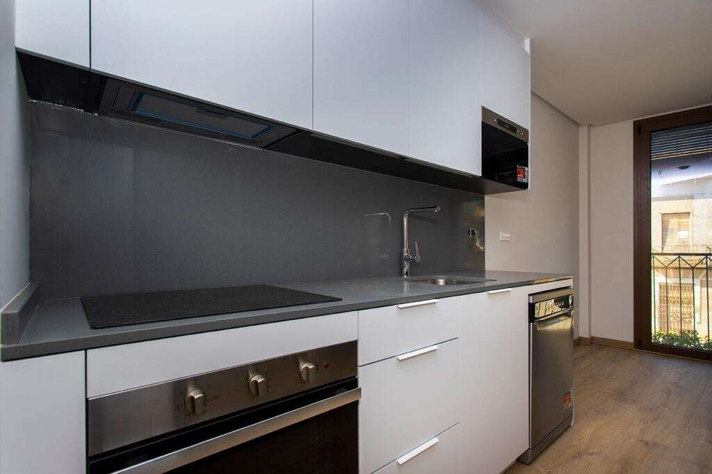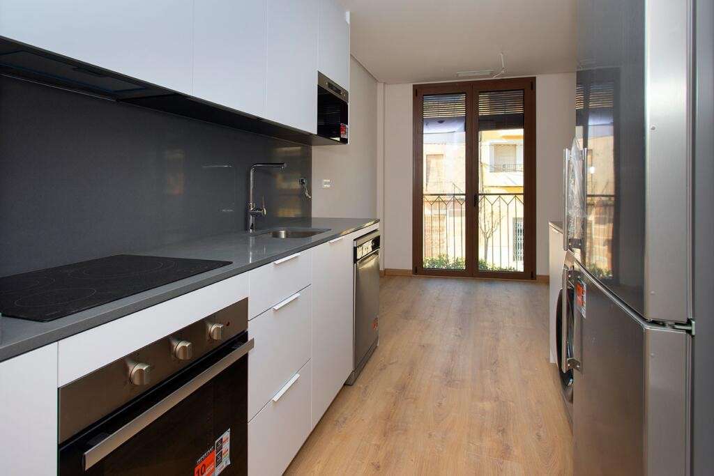 Esta promoción ofrece dos viviendas con una distribución espaciosa y funcional. El apartamento cuenta con tres dormitorios, dos baños, y una cocina completamente amueblada con encimera de granito, Silestone o similar, además de campana extractora.