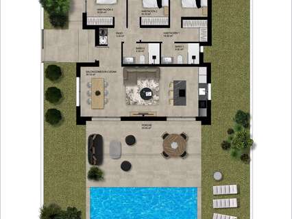 Zona de día: Donde encontramos un amplio salón-comedor con cocina americana (muebles de cocina incluidos) que conecta con el gran porche de carácter moderno a través de sus dos grandes ventanales, dando paso a la zona exterior ajardinada y a la piscina.