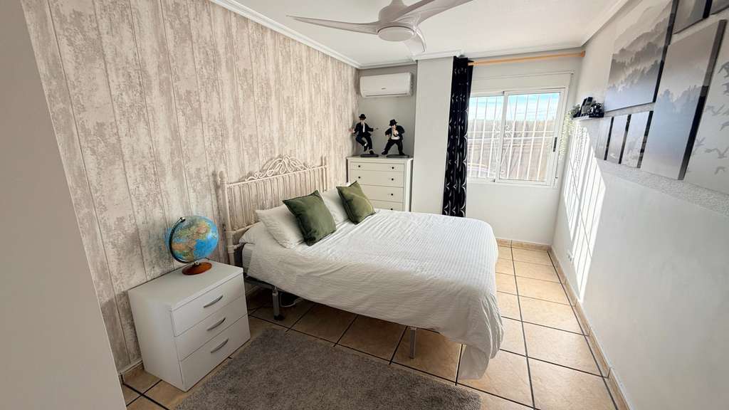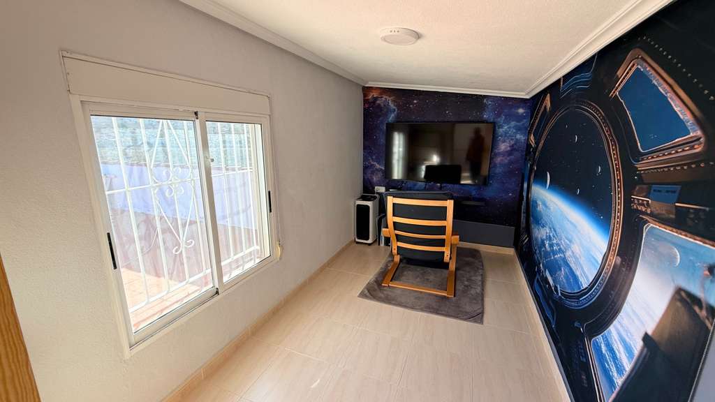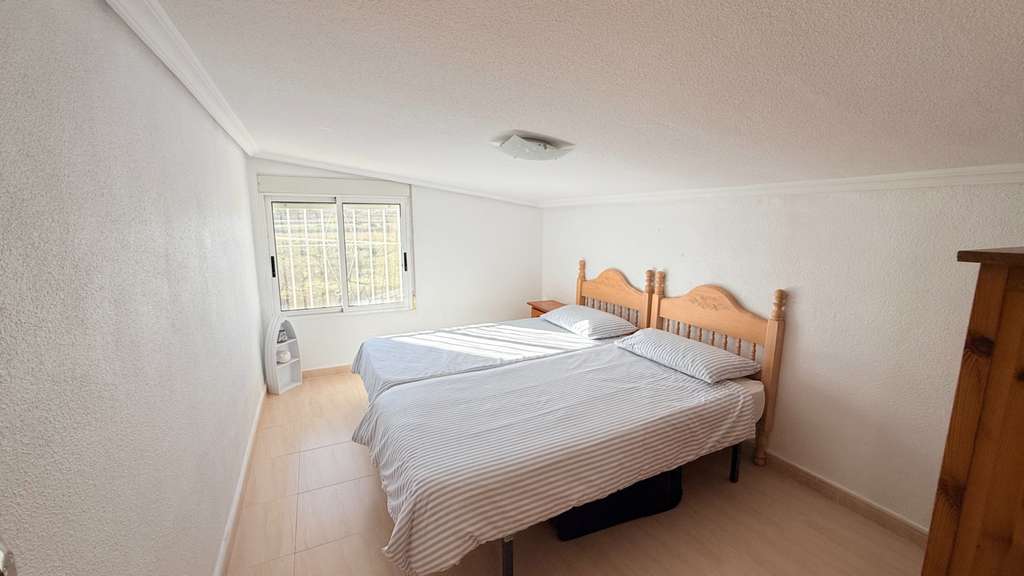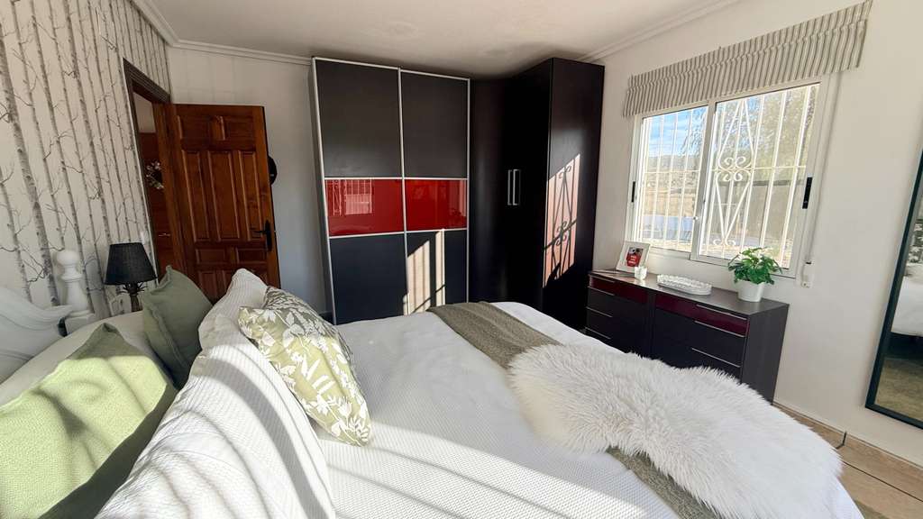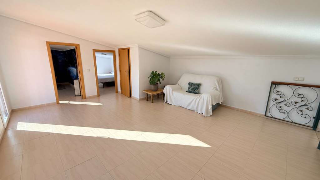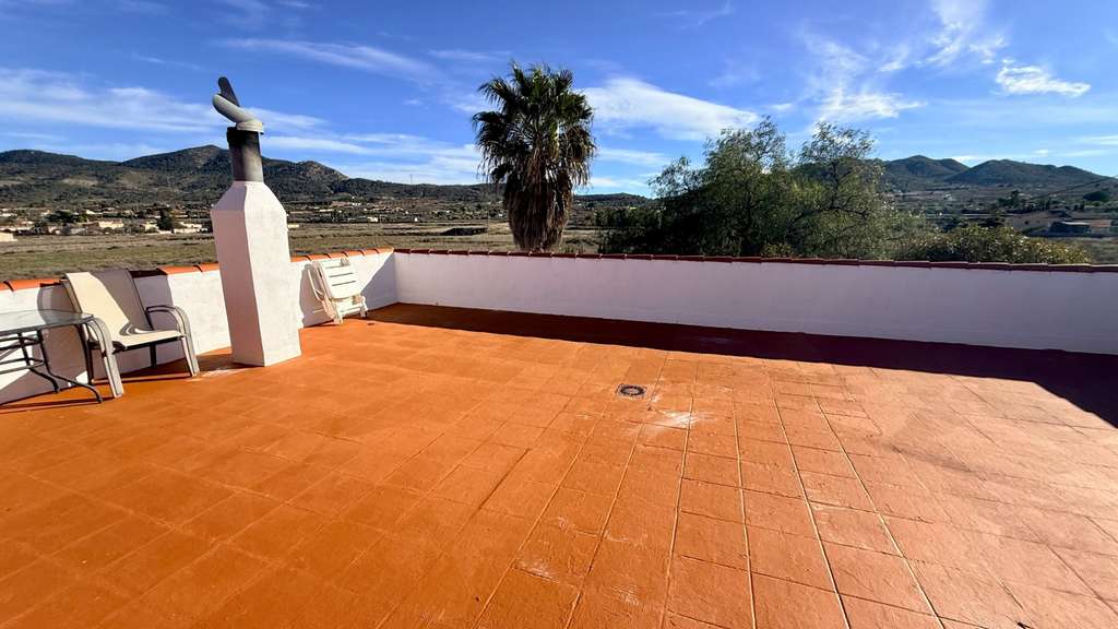 La planta superior ofrece un gran rellano, dos dormitorios adicionales (uno doble y uno individual) y un aseo. Con poca inversión, podría añadirse una ducha y crear un apartamento de invitados. El broche final es el solárium de 42 m², con vistas casi de 360° al Valle de Hondón, la Sierra de Crevillente, Murcia y el propio pueblo.