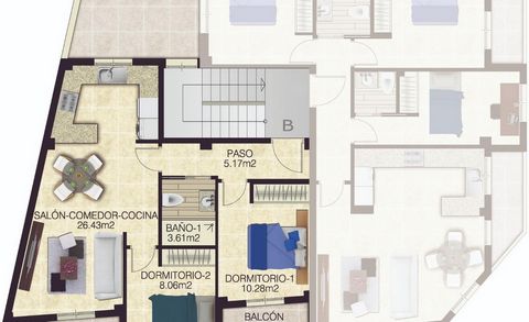 Todas las viviendas están equipadas con suelo radiante en baño, cocina amueblada abierta al salón, armarios empotrados, puerta de entrada acorazada y preinstalación de aire acondicionado.