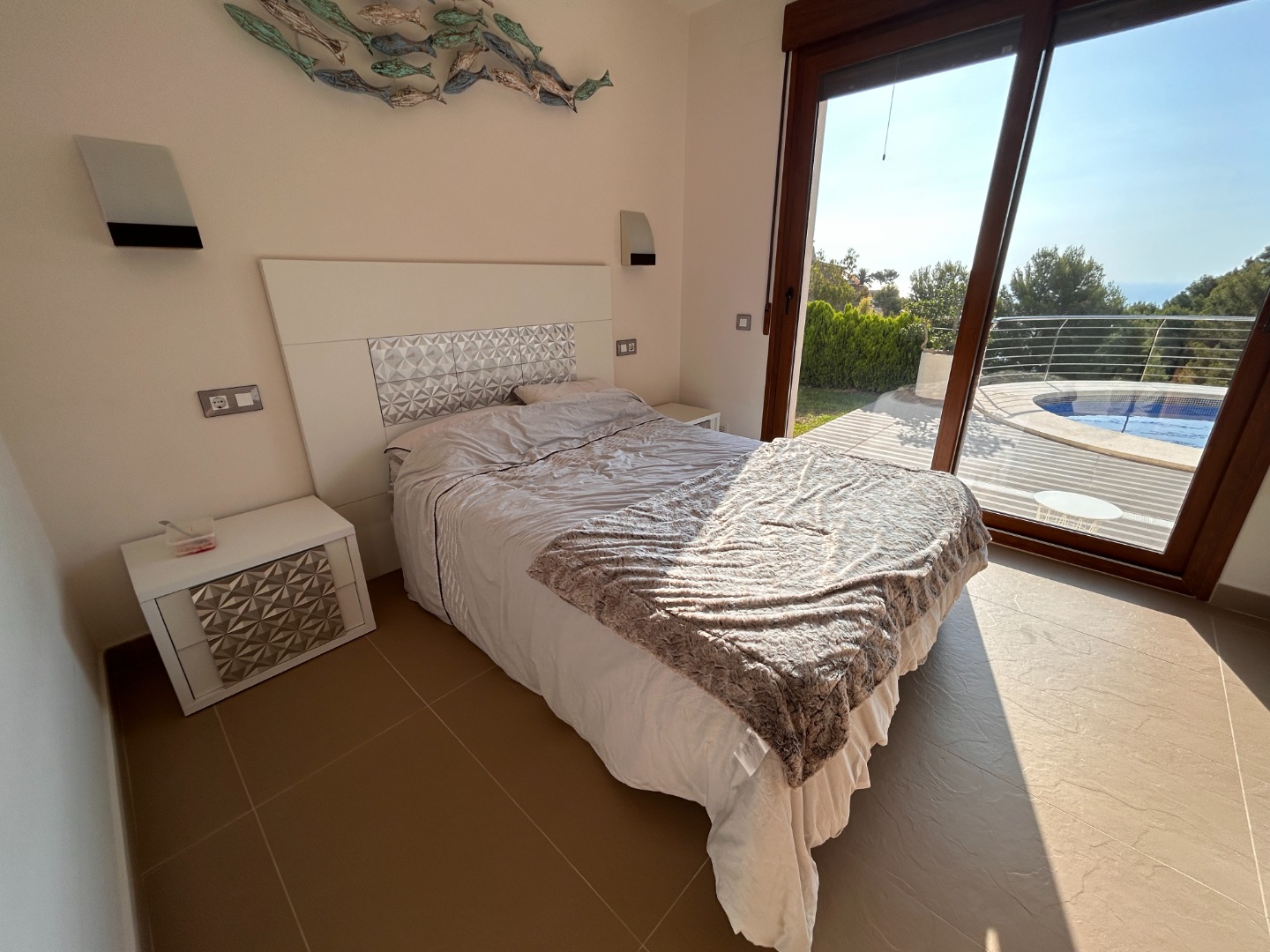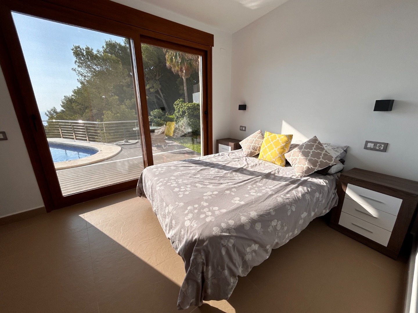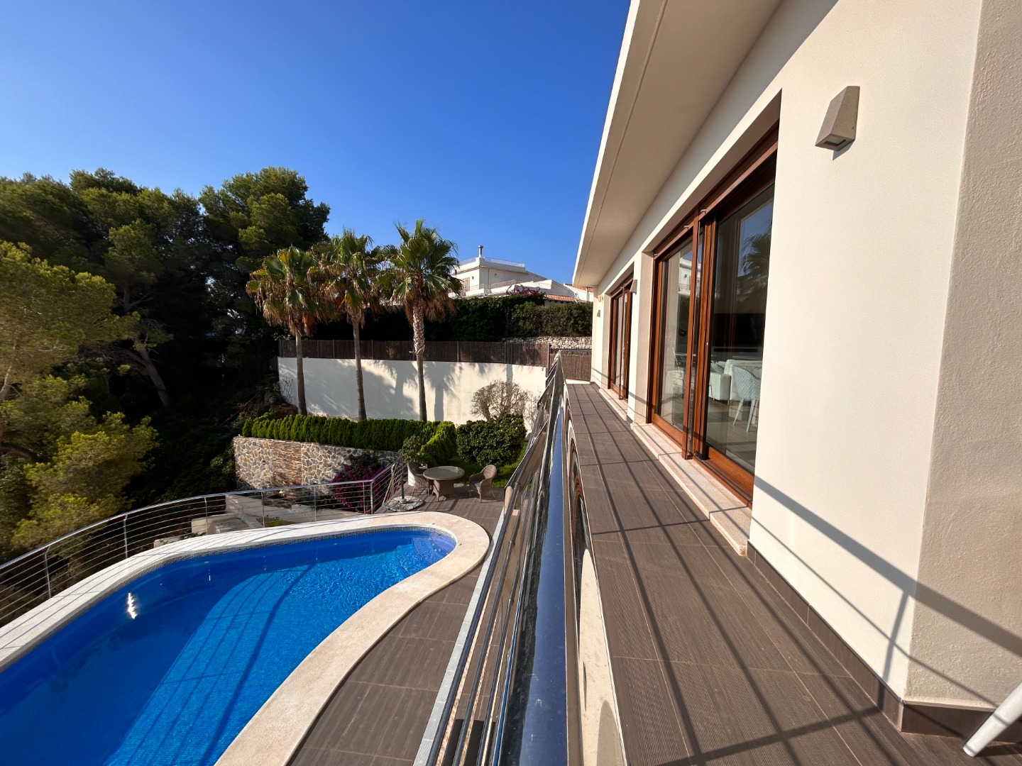 La villa cuenta con dos terrazas, orientadas al este y al oeste, ideales para disfrutar tanto del amanecer como del atardecer sobre el mar. Además, su piscina privada climatizada permite disfrutar del baño todo el año.