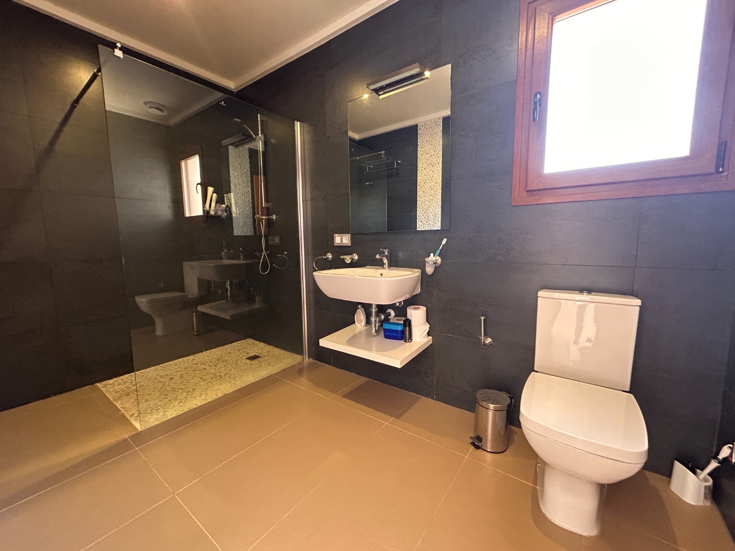 En el interior, la propiedad ha sido recientemente renovada y se presenta en excelente estado, con tres dormitorios con baño privado que ofrecen comodidad y privacidad. También dispone de una habitación adicional que se puede adaptar a sus necesidades: despacho, gimnasio o dormitorio extra.