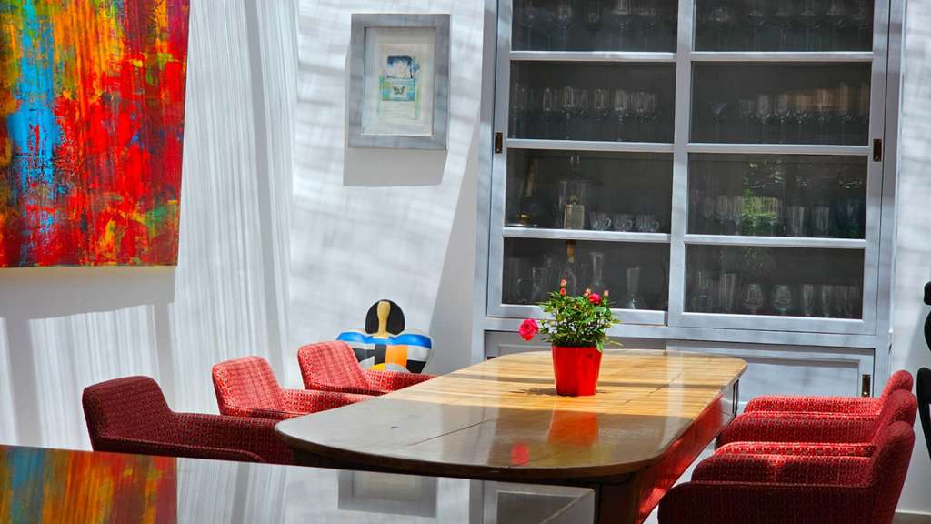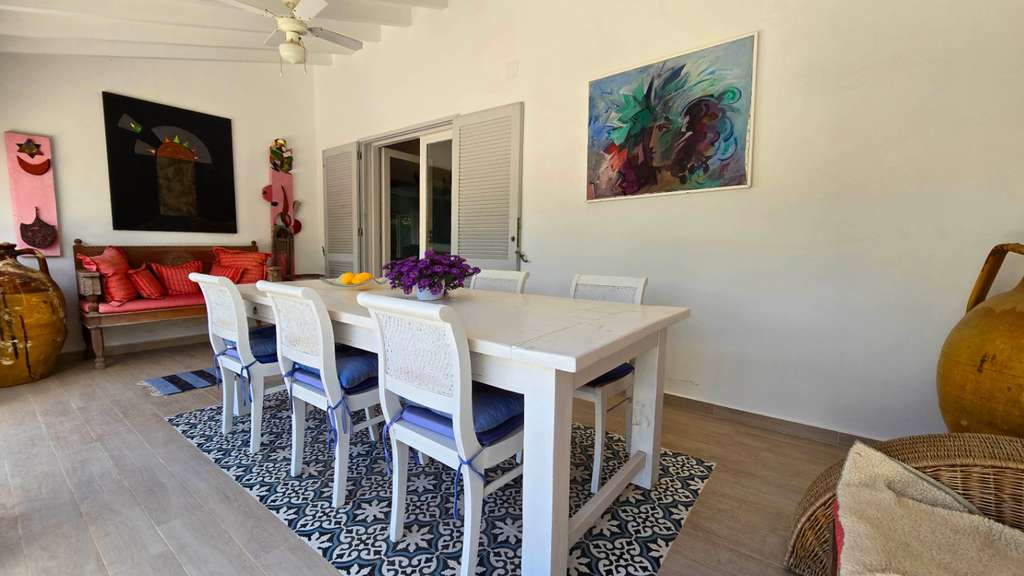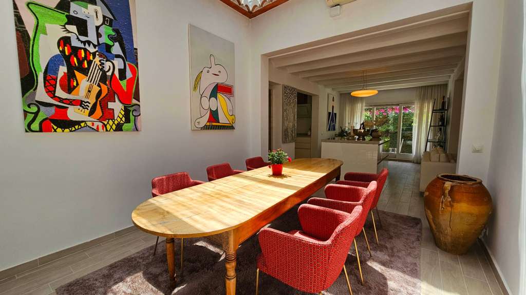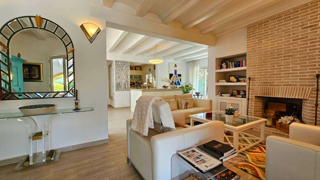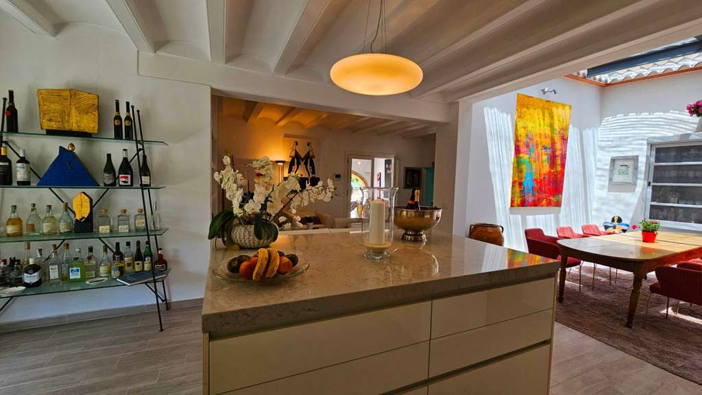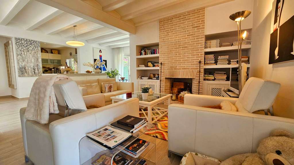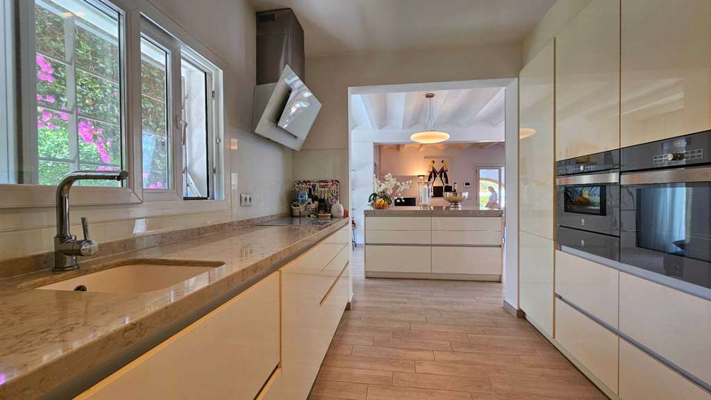 Situada en una parcela plana de 1060m2, esta villa de una sola planta cuenta con un amplio salón con una acogedora chimenea que conduce a una encantadora naya con arcos de piedra de Tosca con vistas al jardín y a la zona de la piscina. El comedor, adyacente a la cocina, está iluminado por un techo de cristal que inunda de luz natural la estancia. La moderna cocina está totalmente equipada con electrodomésticos integrados y está convenientemente adyacente al lavadero.
