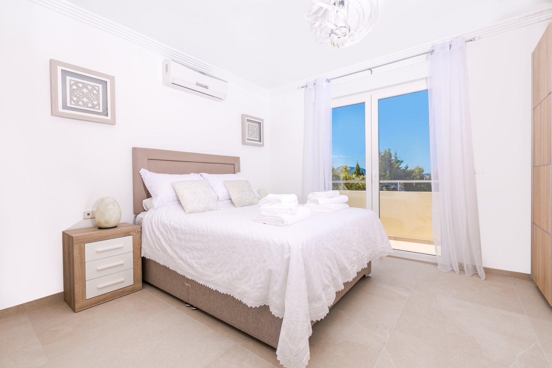 En la primera planta hay dos dormitorios dobles con baño en suite, ambos con puertas que dan a un balcón orientado al sur con vistas a la piscina y los jardines. El dormitorio principal, situado en la primera planta, cuenta con un balcón privado y vistas al Montgó.