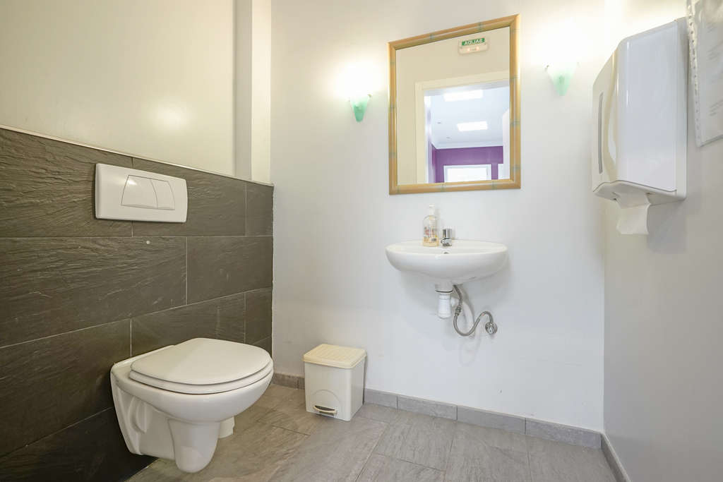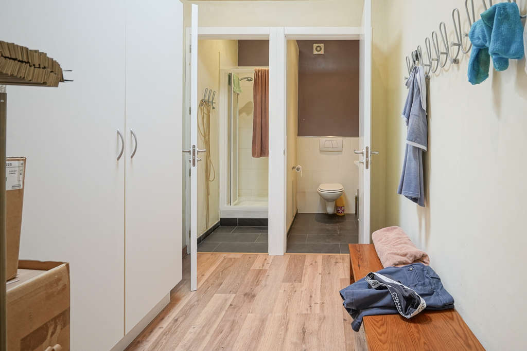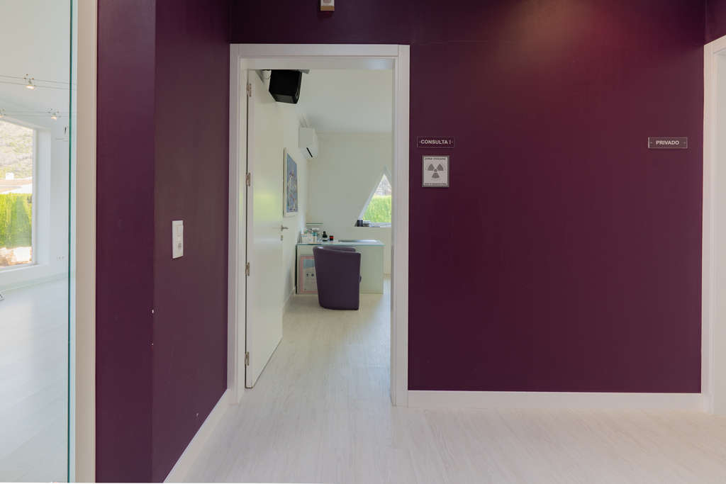 La distribución actual incluye una recepción, una sala de espera, tres salas de tratamiento, una sala de radiología, un aseo, dos vestuarios con cuarto de baño completo cada uno y dos trasteros. El corazón absoluto del edificio es la gran sala de rehabilitación: gracias a su techo alto y a sus numerosas ventanas, se crea aquí una excepcional sensación de espacio y luz. Esta sala se presta perfectamente para ser transformada en una amplia sala de estar con conexión directa a la terraza exterior.