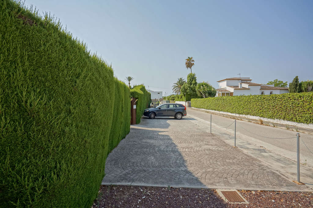 En el exterior hay una amplia terraza orientada al sur que invita a relajarse al sol, mientras que el lado norte de la parcela ofrece unas magníficas vistas al Montgó. El jardín que rodea la propiedad y las múltiples plazas de aparcamiento privadas completan el conjunto.