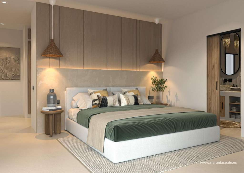 Elegante arquitectura inspirada en Ibiza y el MediterráneoLa villa destaca por su fachada blanca, sus esquinas redondeadas y los detalles en piedra del Montgó tallados a mano, que le aportan calidez y autenticidad. Los acabados de alta calidad, como los suelos de microcemento, las ventanas de aluminio con doble acristalamiento en colores óxido y los grifos negros en los baños, contribuyen a crear un ambiente refinado y contemporáneo. Todas las habitaciones están equipadas con persianas eléctricas exteriores para garantizar el confort y la privacidad.