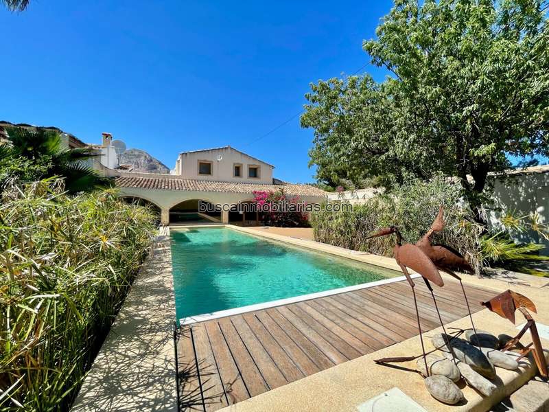 A través de una encantadora naya, se accede a la planta baja de la casa, que ofrece varias habitaciones generosas y multifuncionales que pueden decorarse totalmente a su gusto. También hay una espaciosa cocina con acceso directo a un patio, donde encontrará una cocina exterior, completa con un auténtico horno de pan y pizza.La propiedad también cuenta con un hermoso Riu Rau, una característica terraza cubierta, que está perfectamente conectada a la casa y ofrece encantadoras vistas del cuidado jardín, la terraza y la acogedora piscina.En la planta superior, a la que se accede por una escalera interior, se encuentra el generoso dormitorio principal con vestidor y baño en suite. Esta habitación ofrece acceso directo a una amplia terraza exterior con impresionantes vistas al Montgó y sobre el hermoso jardín hacia el valle verde. Además, hay dos dormitorios dobles completos con un baño compartido, equipado con bañera y ducha.El ala lateral de la casa está habilitada como casa de invitados totalmente independiente, equipada con su propia cocina, lavadero, cuarto de baño, dormitorio y una cómoda zona de estar/salón. Desde esta habitación hay acceso directo a una terraza privada, ideal para invitados.En la parte delantera de la parcela, cerca de la entrada, hay aparcamiento para varios vehículos, un amplio garaje y un huerto. También encontrará aquí una atractiva naya, el lugar perfecto para disfrutar del aire libre y del clima mediterráneo.