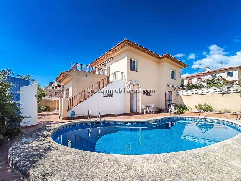 Chalet de 4 dormitorios (dividido en 2 plantas pudiendo hacerse 2 apartamentos independientes) de orientación este con amplia terraza con vistas al mar, la bahia de Altea y Sierra Bernia, garaje, piscina privada y 440m2 de parcela en urbanización tranquila cercana a supermercados.