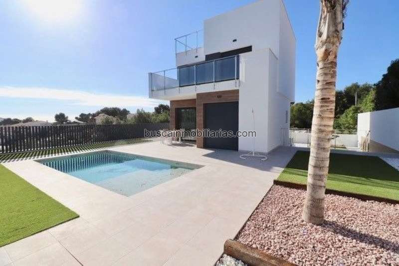 La villa cuenta con 3 dormitorios, uno en planta baja y dos en la segunda planta.