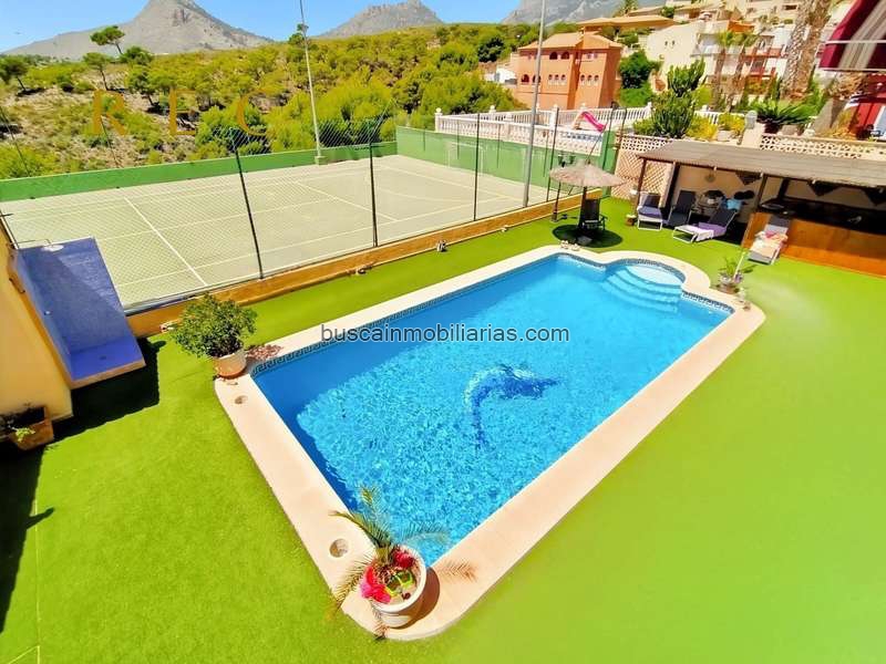 Espectacular chalet en La Nucía de 373 m² construidos en parcela de 1.496 m². Cuenta con 6 habitaciones, 4 baños, piscina privada, pista de tenis, garaje de 900 m², bodega, calefacción radiante y aire acondicionado. Con vistas al mar y montañas, es ideal para disfrutar de lujo y confort.
