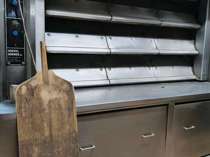 Hornos grandes para hornear pan Mezclador y espacio de trabajo Vitrinas de cristal y mostrador de caja Instalaciones con baño Un montacargas para transportar productos al sótano.