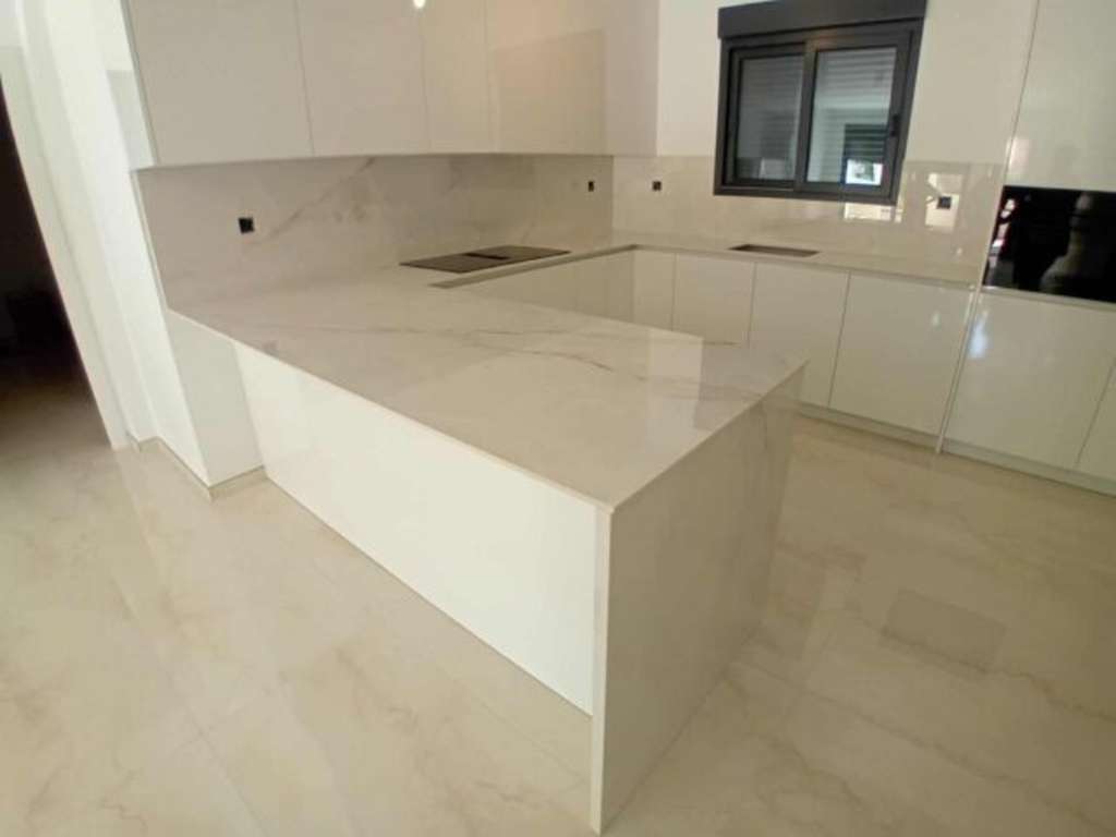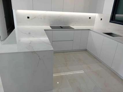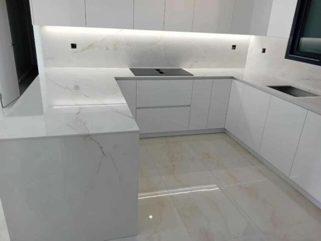 Cocina equipada con muebles altos y bajos hasta el techo, encimera de Silestone o similar y espacio previsto para frigorífico, lavavajillas y horno.