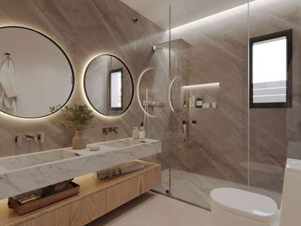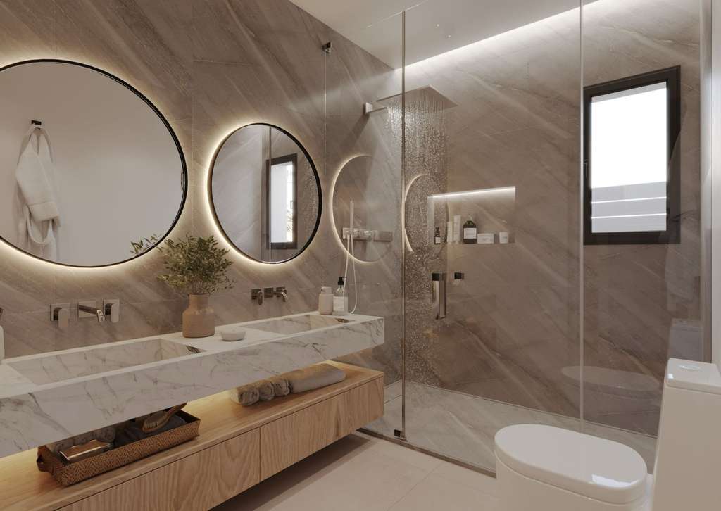Baños completos con inodoros, platos de ducha con mampara, muebles con lavabo empotrado y espejo.