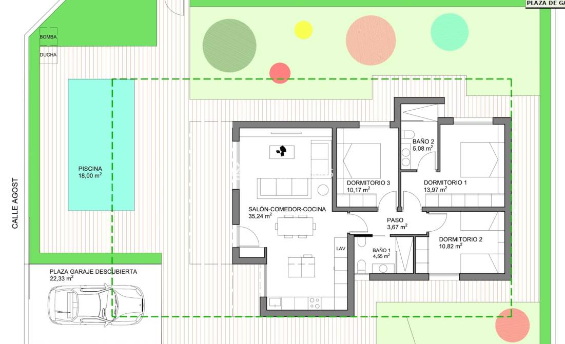 La villa se sitúa sobre una amplia parcela, que se entregará completamente vallada y con puerta de acceso eléctrica, garantizando privacidad y seguridad. La piscina privada está incluida en el precio, permitiéndole disfrutar desde el primer momento del estilo de vida al aire libre y del agradable clima mediterráneo.