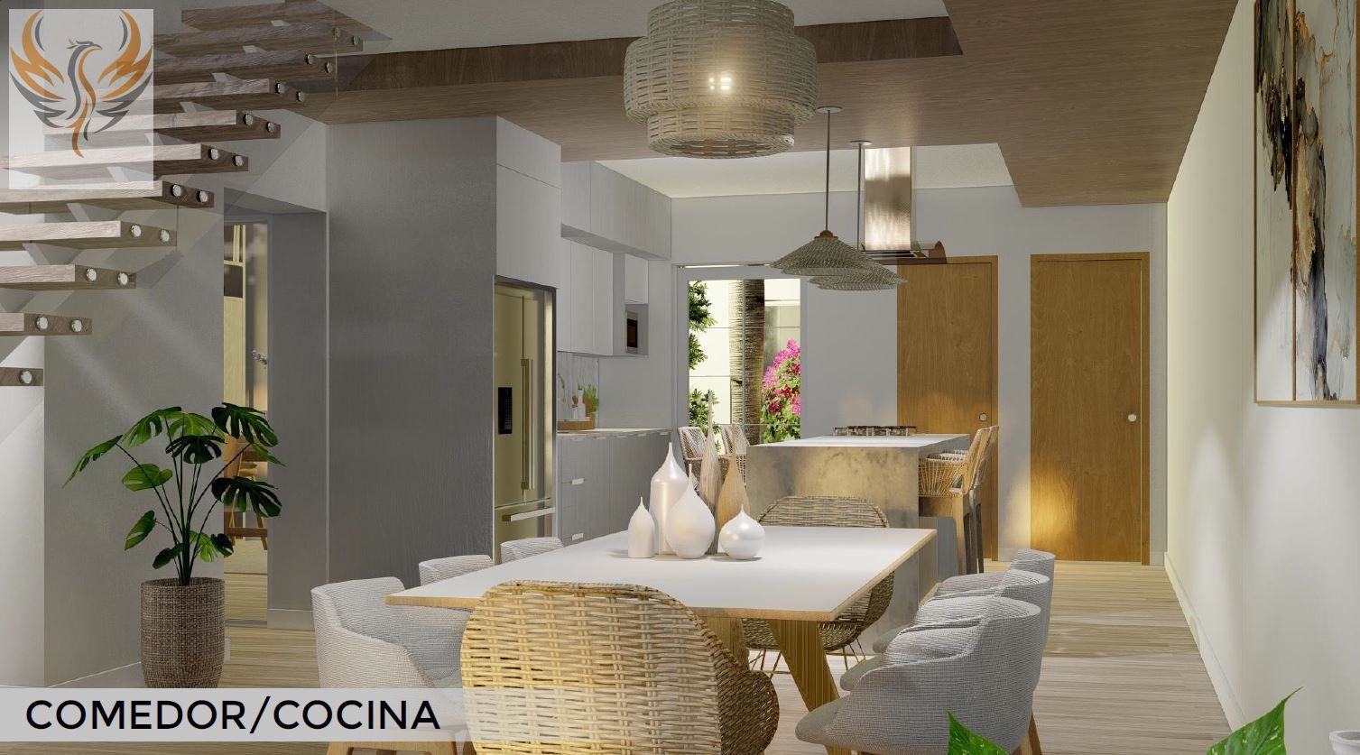 - Muebles de cocina altos y bajos con encimeras y entrepaños a juego en material de alta durabilidad. Equipadas con frigorífico, lavavajillas, horno, microondas, sistema de inducción oculto y campana extractora.