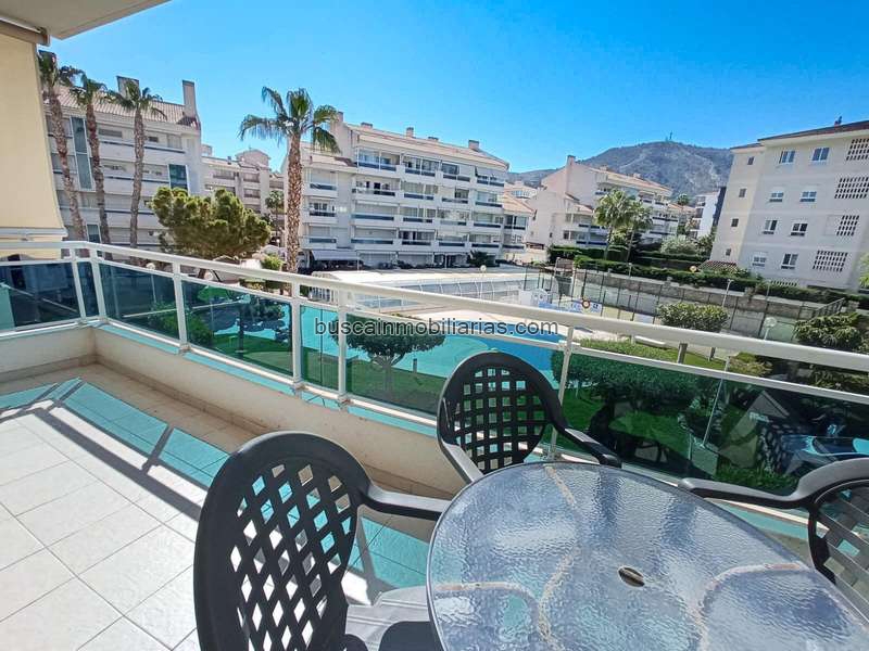 Apartamento de esquina con dos dormitorios, dos baños, cocina independiente, galería y amplia terraza con orientación sur en urbanización muy cotizada del Albir con plaza de garaje, piscina comunitaria, piscina cubierta, pista de pádel y zonas ajardinadas a sólo 400m de la playa.