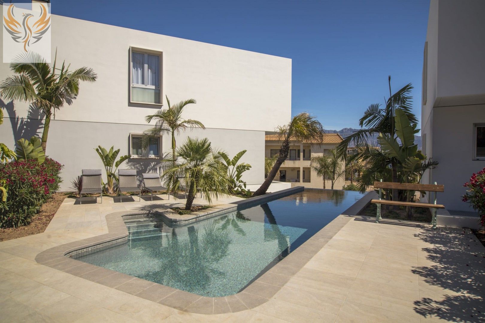 Cuatro lujosos chalets pareados, de cuidado diseño, en un enclave único con vistas a la bahía de Altea y la playa del Albir, en una zona muy tranquila y a pocos metros de la entrada del Parque Natural de Sierra Gelada. Cuentan con piscina común, con un sistema de depuración del agua por dosificadores automáticos de sal marina, al aire libre, abierta todo el año y vistas al mar. Las villas se encuentran a sólo cinco minutos caminando de la playa y de la zona comercial del Albir donde están las tiendas y restaurantes. Cada villa cuenta con una superficie total de 235 m2 repartidos en cuatro dormitorios (que pueden hacerse con una gran cama doble o dos individuales), dos cuartos de baño completos más un aseo adicional, una cocina totalmente equipada con electrodomésticos Siemens (incluyendo lavadora, lavavajillas, placa vitrocerámica, horno, microondas, hervidor eléctrico y cafetera), salón comedor con terraza con vistas al mar y a la montaña, sala de juegos y área de fitness con salida directa al jardín.