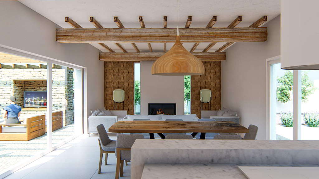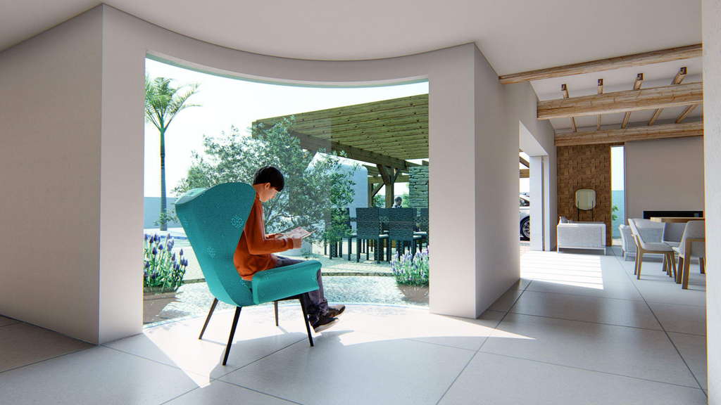 El proyecto ibicenco se distingue por su disposición en L en planta, destacando un volumen que alberga el salón-cocina-comedor, con una gran cristalera corredera que se oculta en la tabiquería y se abre hacia la zona pergolada y terraza con piscina orientada al sur. Además, cuenta con una gran pérgola sobre la zona de aparcamiento, ofreciendo un espacio cubierto adicional al aire libre.