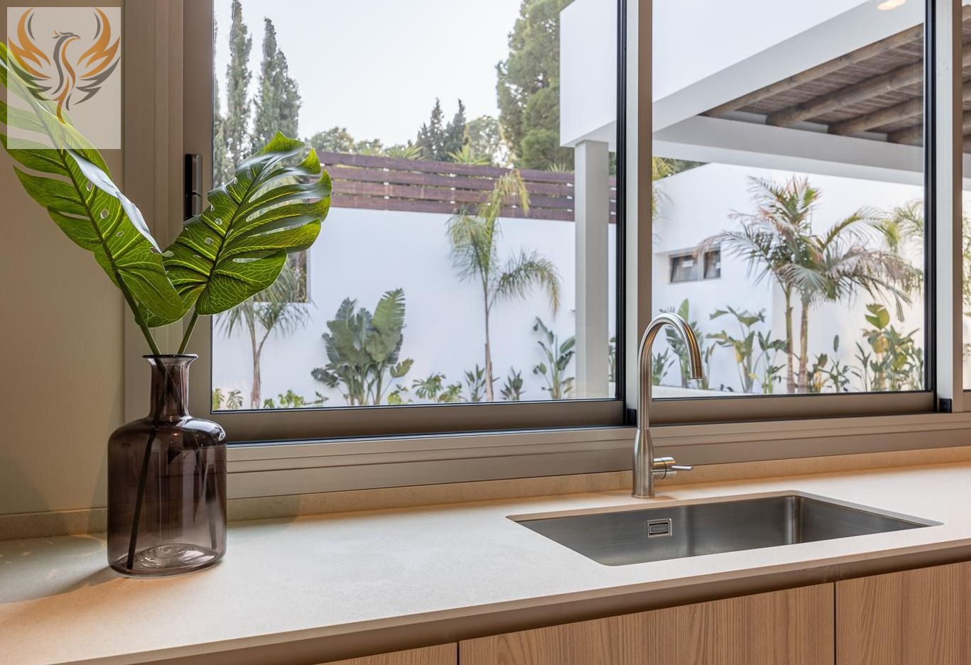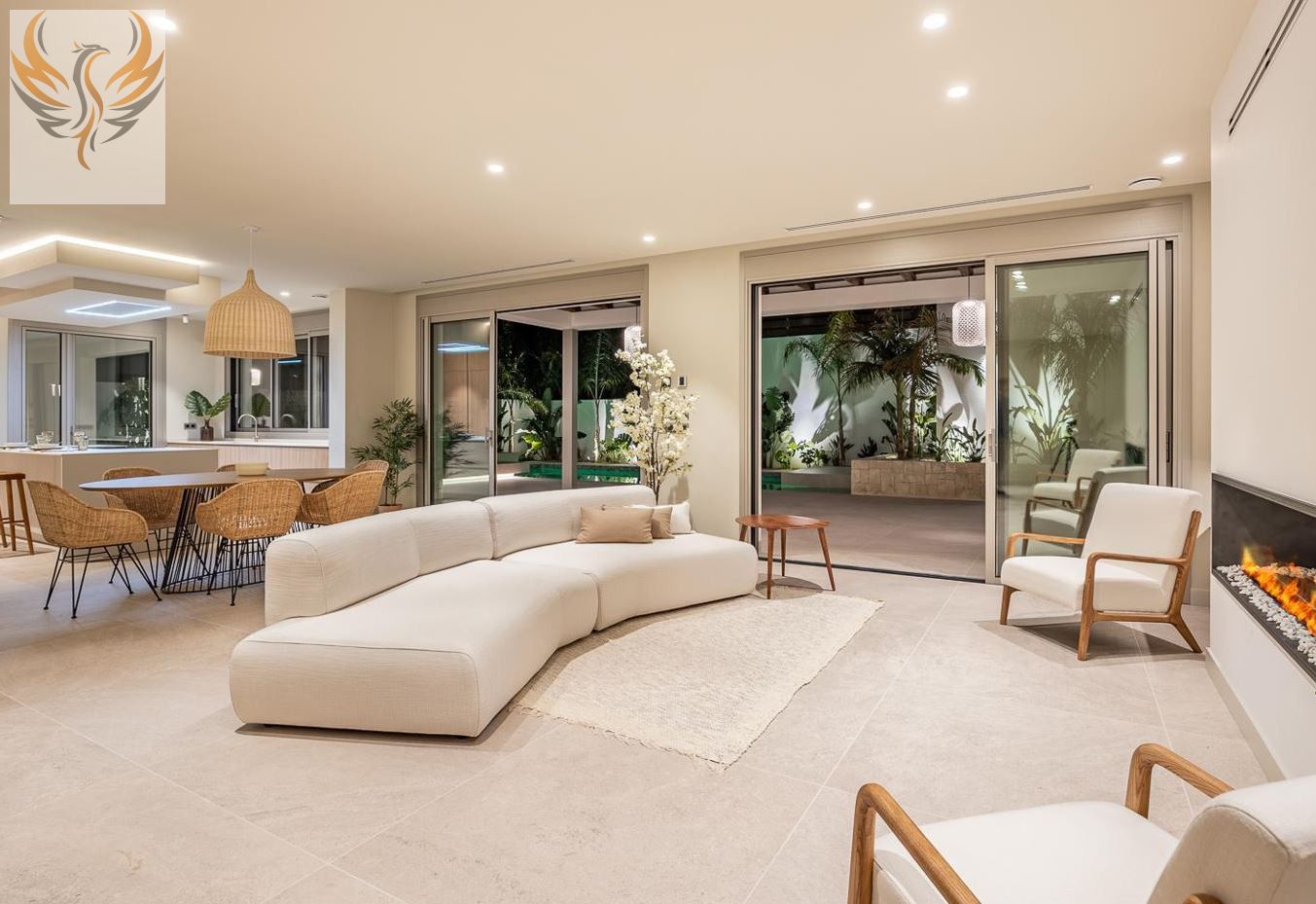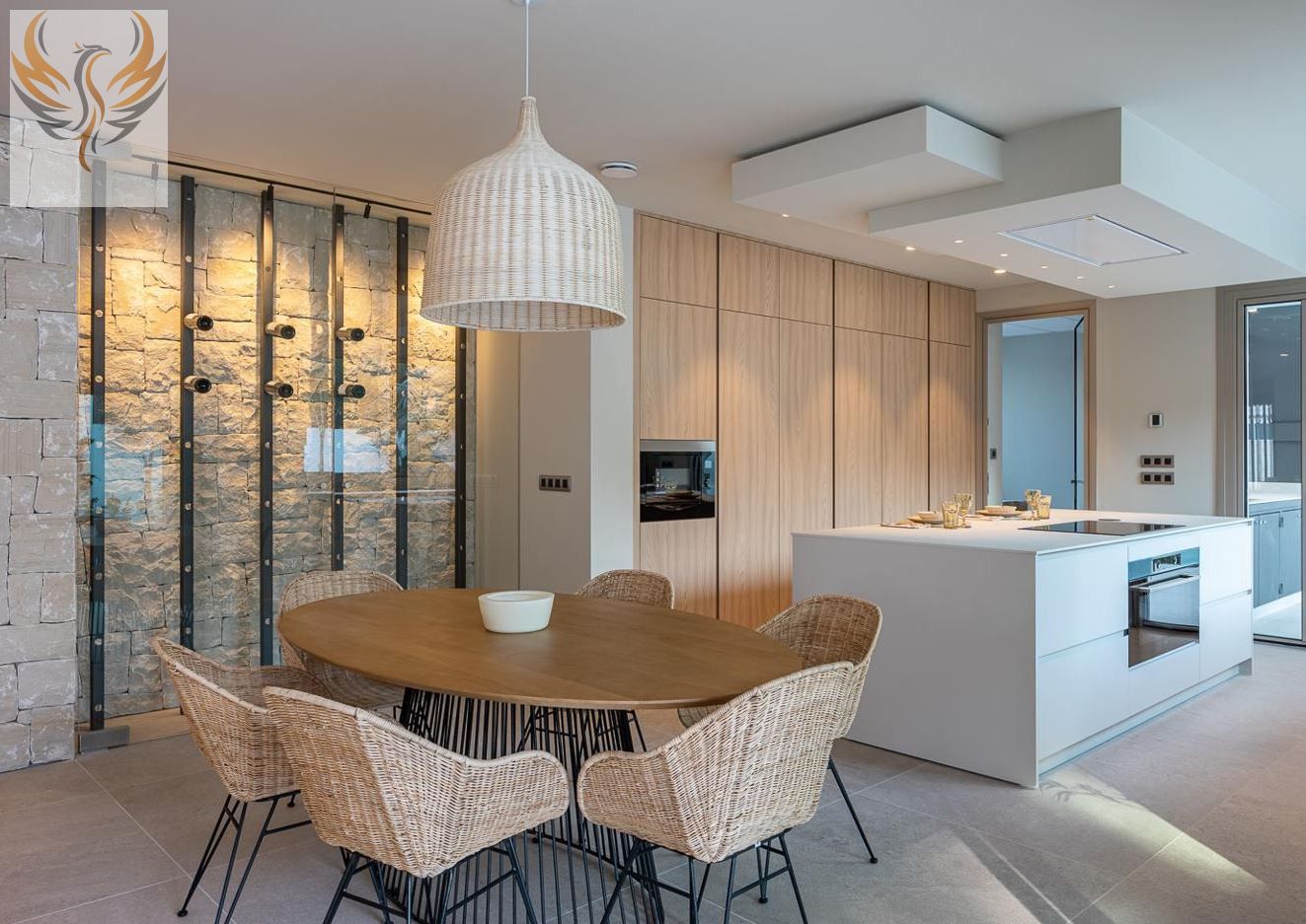 La Villa dispone de una amplia sala de estar, que cuenta con ventanas de piso a techo que permiten la entrada de mucha luz natural. Desde allí, podrás observar el comedor y la cocina, ideales para recibir a invitados o disfrutar de una comida en familia.