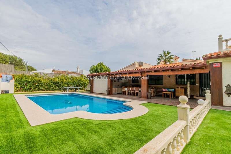 Al otro lado de la casa, la piscina rodeada de césped artificial de primera calidad, una zona para descansar, jugar o comer con su pérgola con toldo.