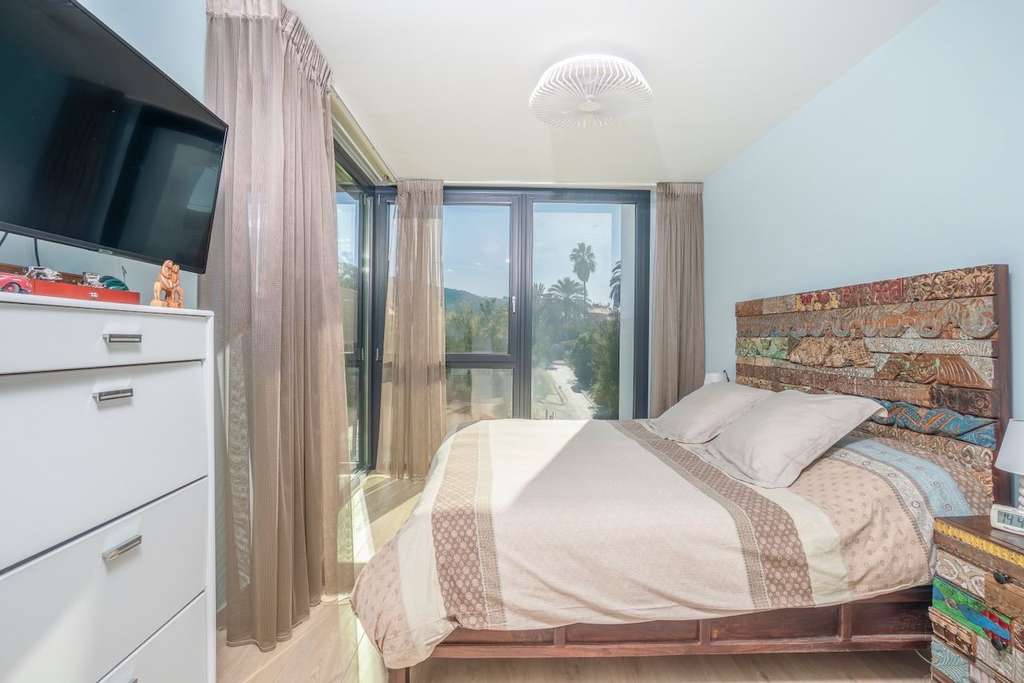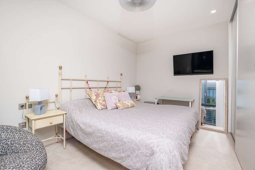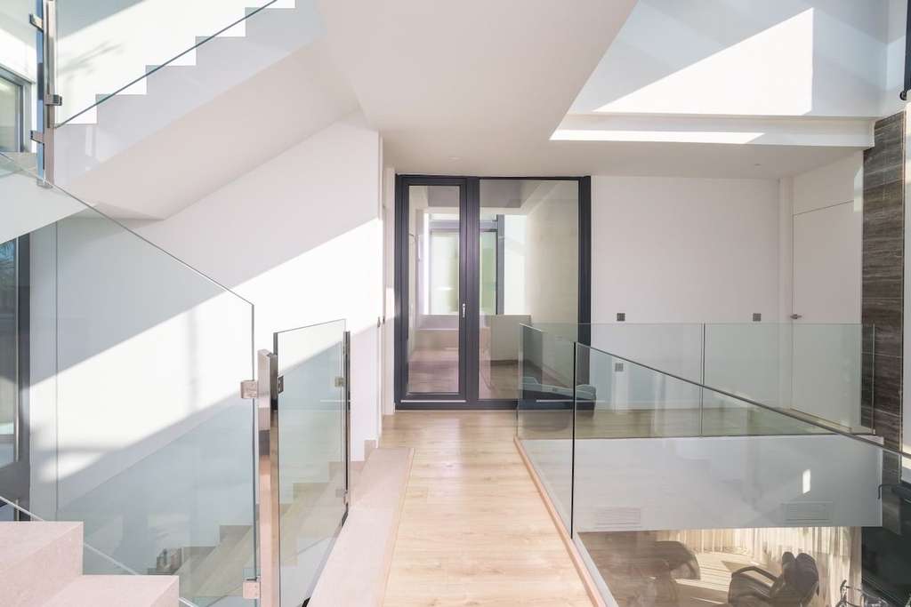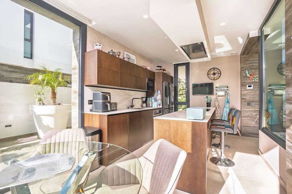 La propiedad se distribuye en varias plantas. En la planta principal se encuentra un amplio y luminoso salón con cocina abierta, un dormitorio y un baño completo. La planta superior alberga el dormitorio principal y dos dormitorios adicionales; todos ellos cuentan con baño en suite y grandes ventanales que aportan abundante luz natural.