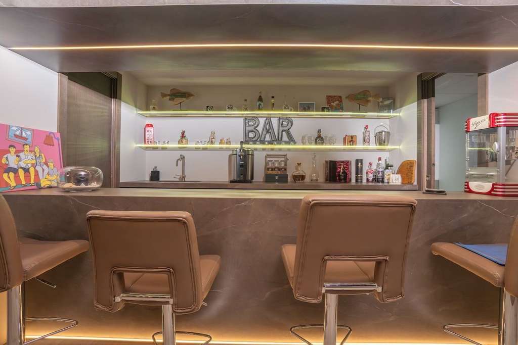 El sótano, diseñado como un espacio multifuncional, incluye un gran salón con zona de billar, bar y cine, una despensa y un baño completo con ducha. En esta planta también se encuentra un patio interior que aporta luz natural, así como la lavandería, el cuarto de maquinaria y un amplio garaje.