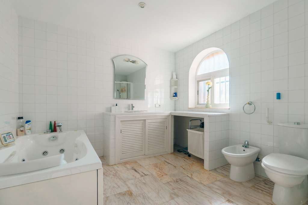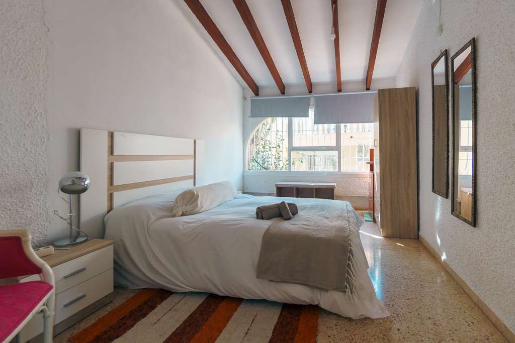 La vivienda principal se desarrolla en una sola planta y ofrece dos amplios dormitorios, ambos con baño en suite, además de un aseo de cortesía. Dispone también de un luminoso salón-comedor, una cocina independiente y un despacho que puede utilizarse como tercer dormitorio. La casa incluye un garaje con zona de lavandería, varios espacios de almacenaje y un agradable patio interior, con espacios amplios y muchas posibilidades de reforma.