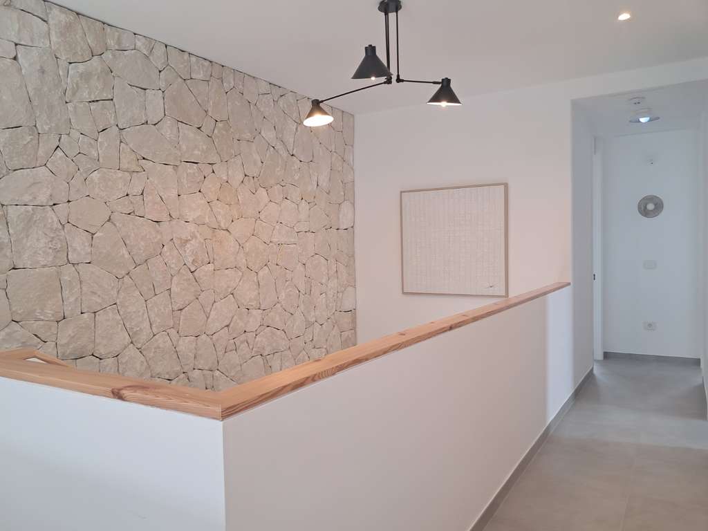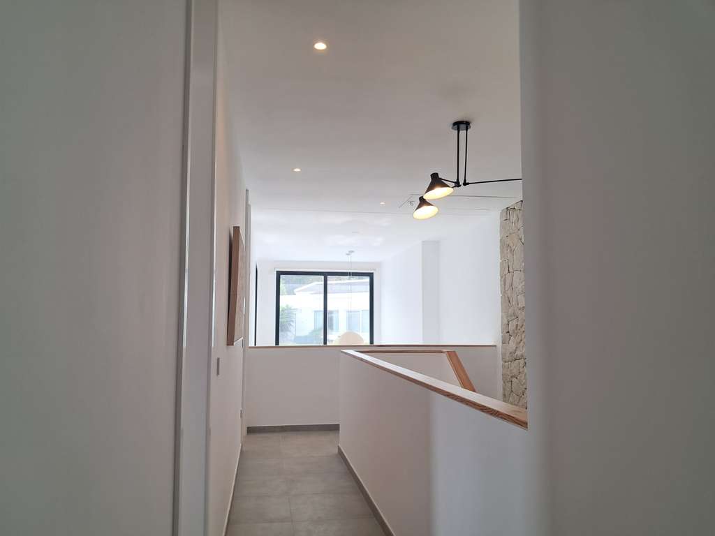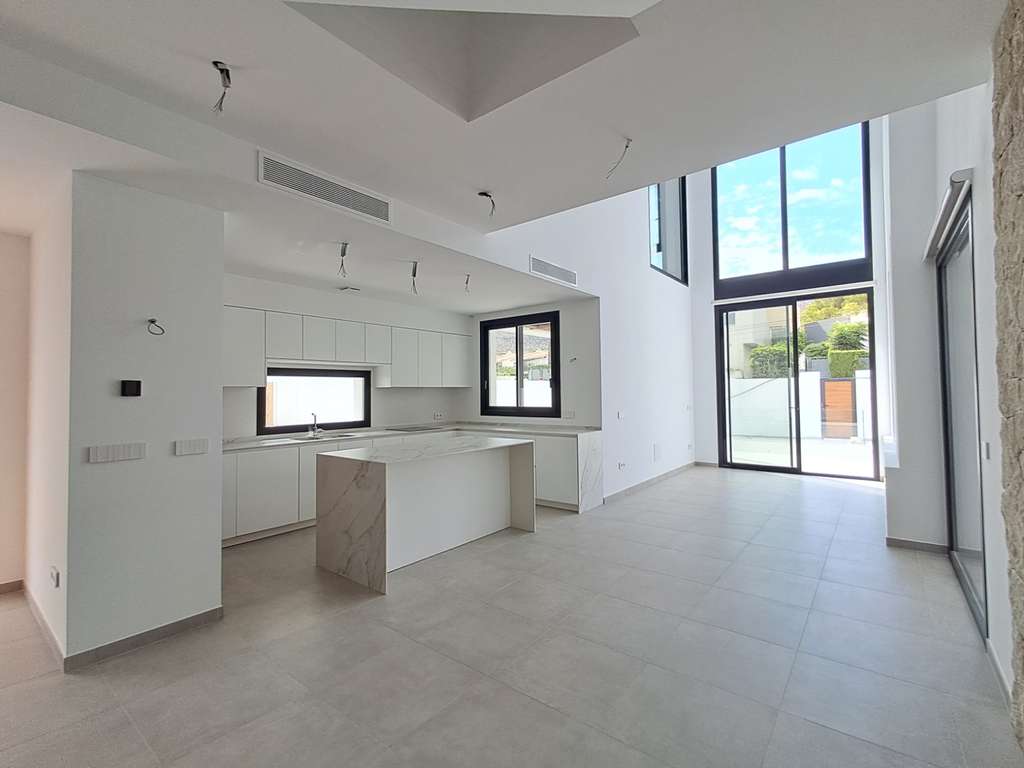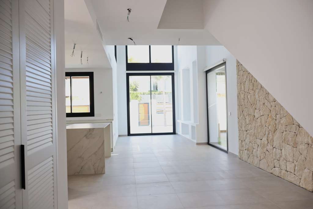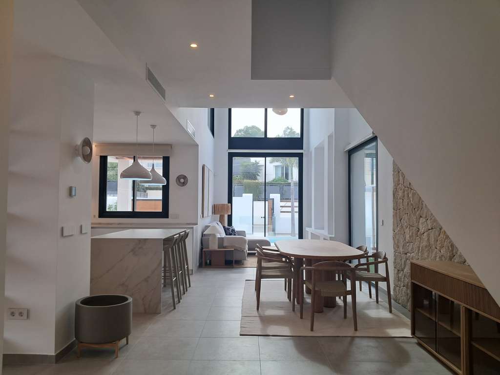 El interior destaca por su luminoso salón con doble altura, cocina abierta completamente equipada con electrodomésticos de alta gama, bodega, patio interior con lucernario, escalera flotante y amplios ventanales que conectan los espacios interiores con jardines y terrazas.
