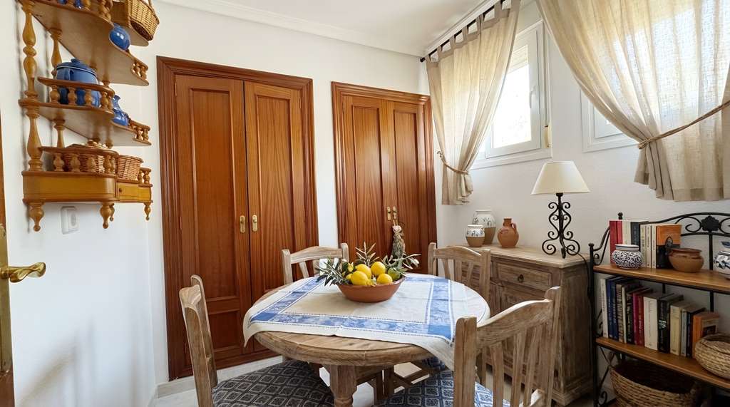 La cocina es luminosa, funcional y está totalmente equipada con electrodomésticos de calidad. El salón-comedor, con un diseño singular y lleno de personalidad, cuenta con chimenea y acceso directo mediante puertas acristaladas a los jardines y piscina comunitaria.