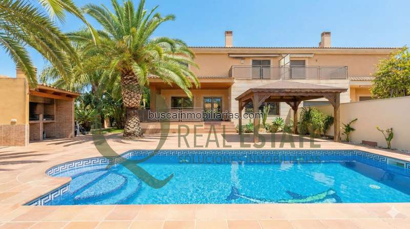 El exterior es uno de sus grandes atractivos: una parcela muy disfrutable con piscina, barbacoa, zonas ajardinadas y pérgola para sombrear y alargar las sobremesas. La piscina recibe sol todo el día, y la vivienda ofrece espacio de aparcamiento para dos coches, un plus importante en chalets en Mutxamel con parcela.